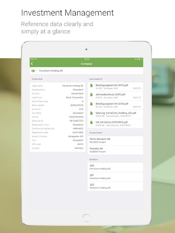 Transfer corporate information, boards, mandates and according documents from your otris corporate investment portfolio management solution to a mobile device. The advantage: The selected corporate portfolios are available in any place, even when you are offline.