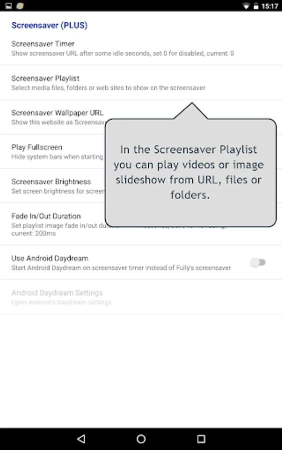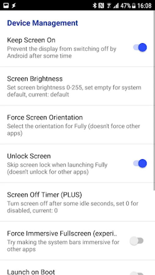 * Configure your device for the best user experience: fullscreen mode, set screen brightness/orientation, keep screen on, skip the lockscreen, autostart@boot, scheduled wake-up and sleep times, enhanced screensaver