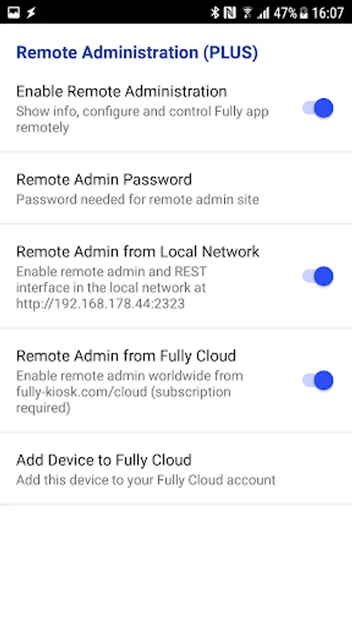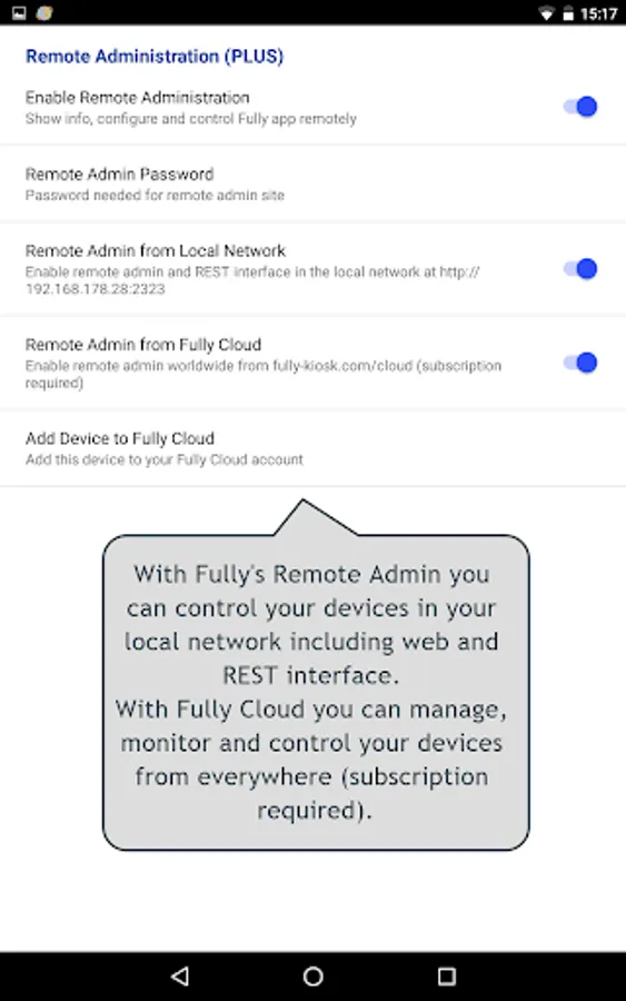 * Remote Admin the Kiosk Browser in the local network or worldwide from Fully Cloud
