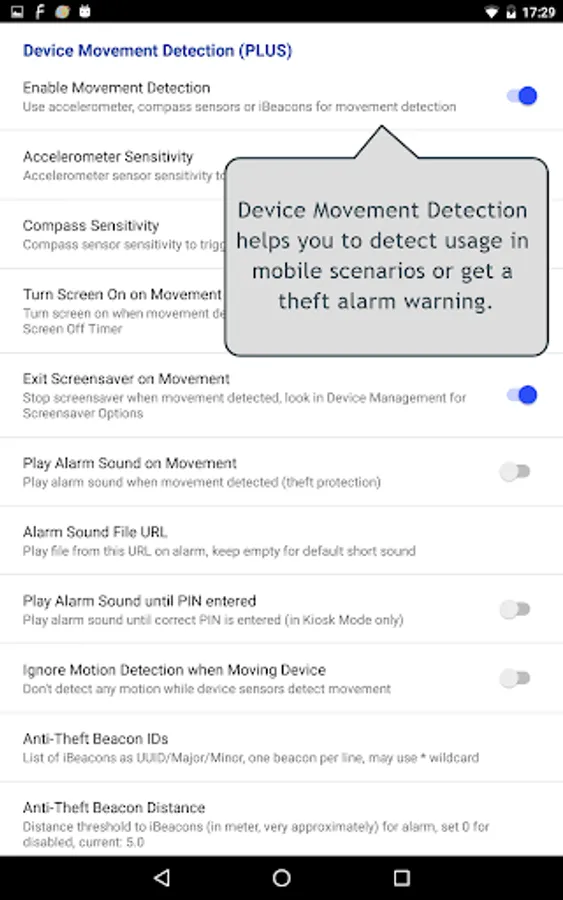 * Device Movement Detection using compass, accelerometer or iBeacons, theft alarm or other action