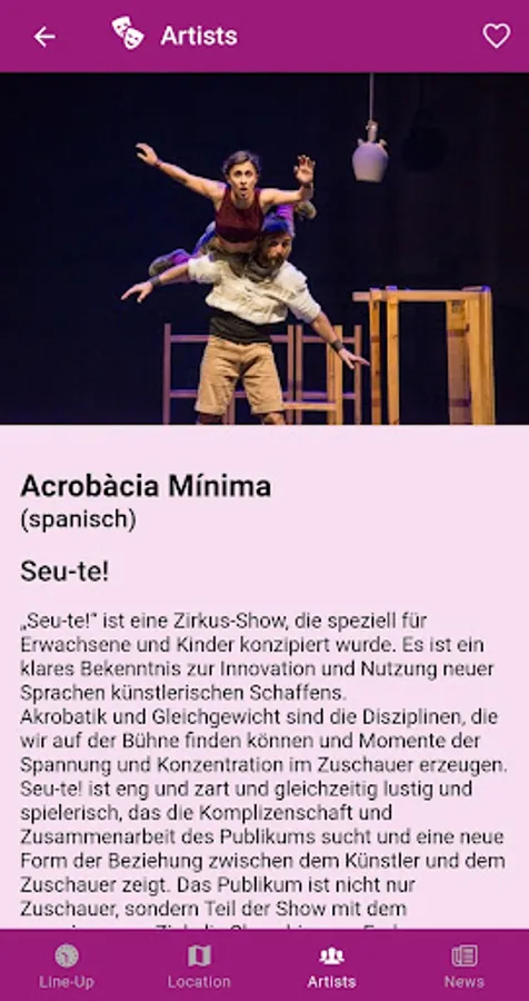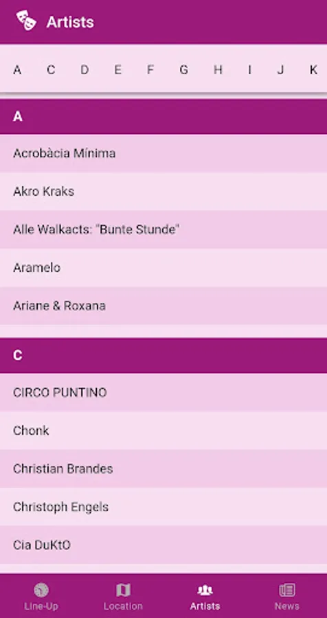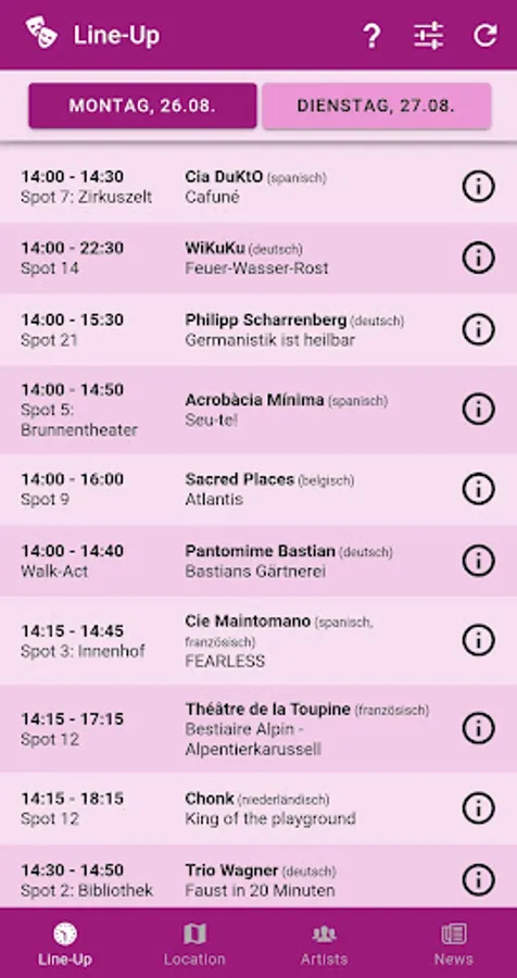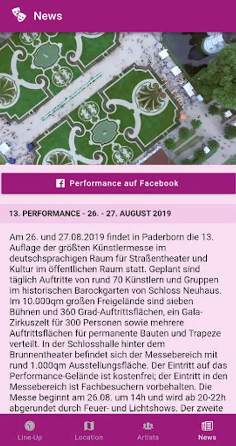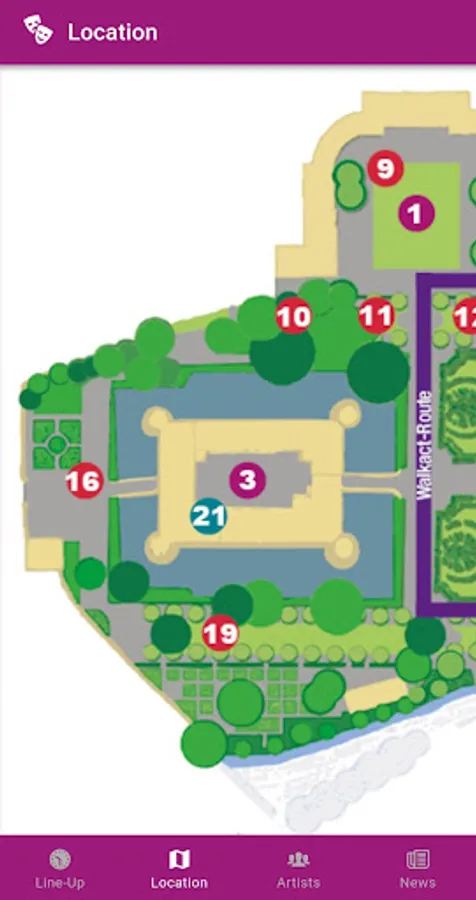 - Line-Up: Filterable by location and time. By GPS-location you get the schedule of the stage in your area indicated.