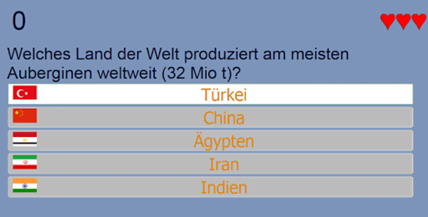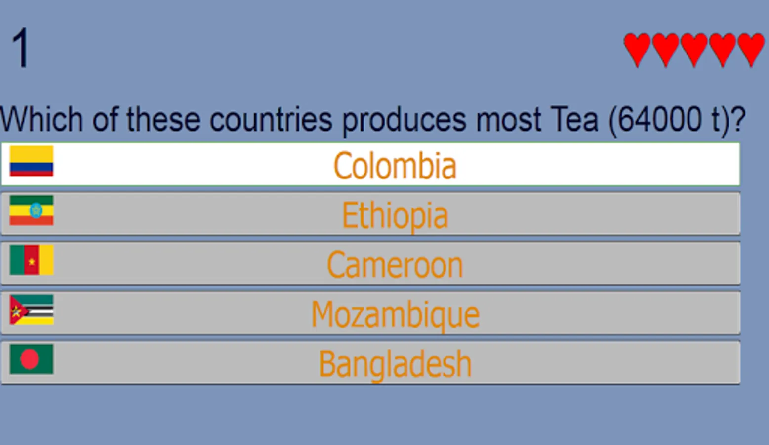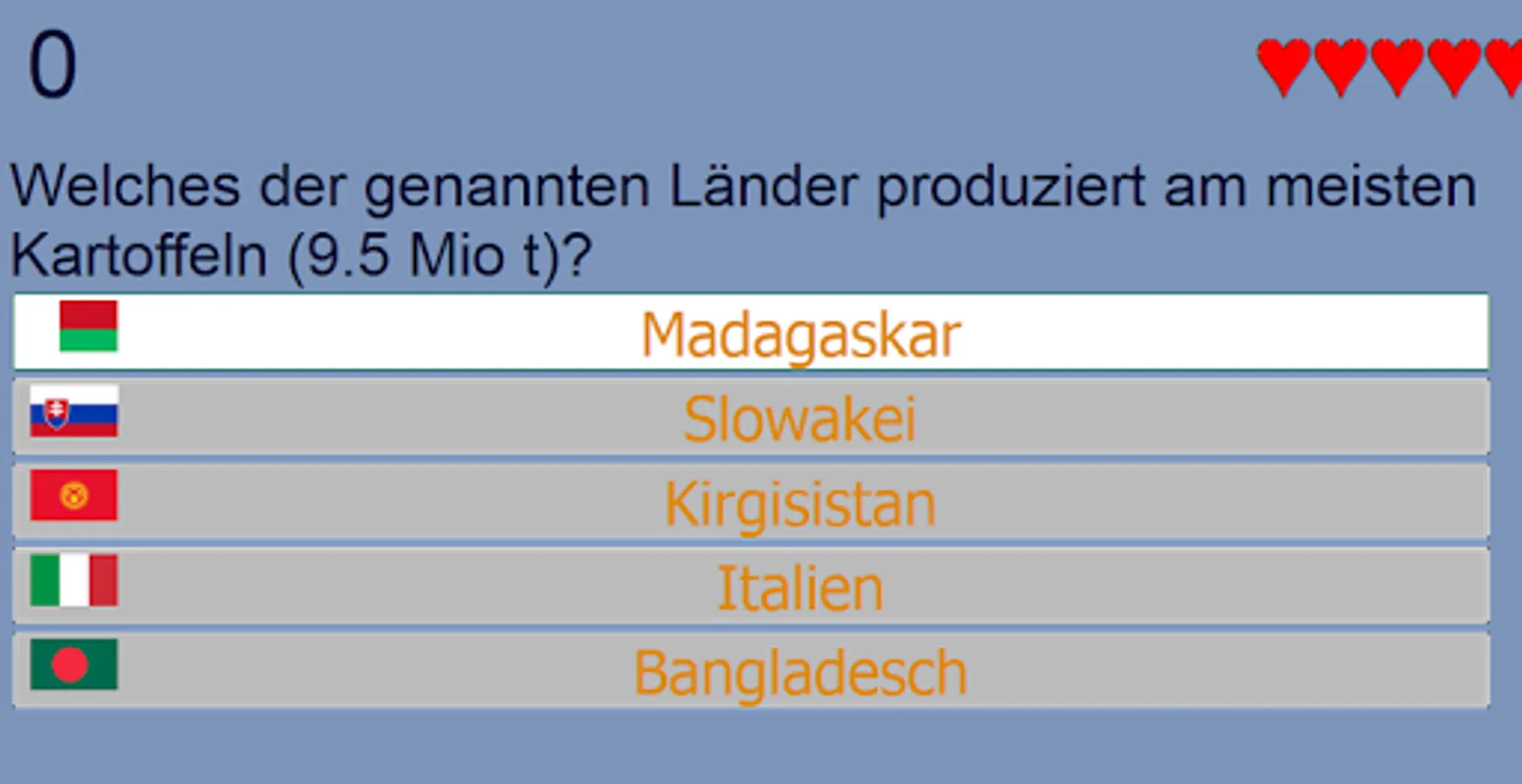 Simple Trivia game in which questions are generated from data of FAO of UN and World Bank data. All data is from 2016. Also, the flags of contries are part of the trivia questions. The app works offline, is free, does not leech your data and is a very small download.