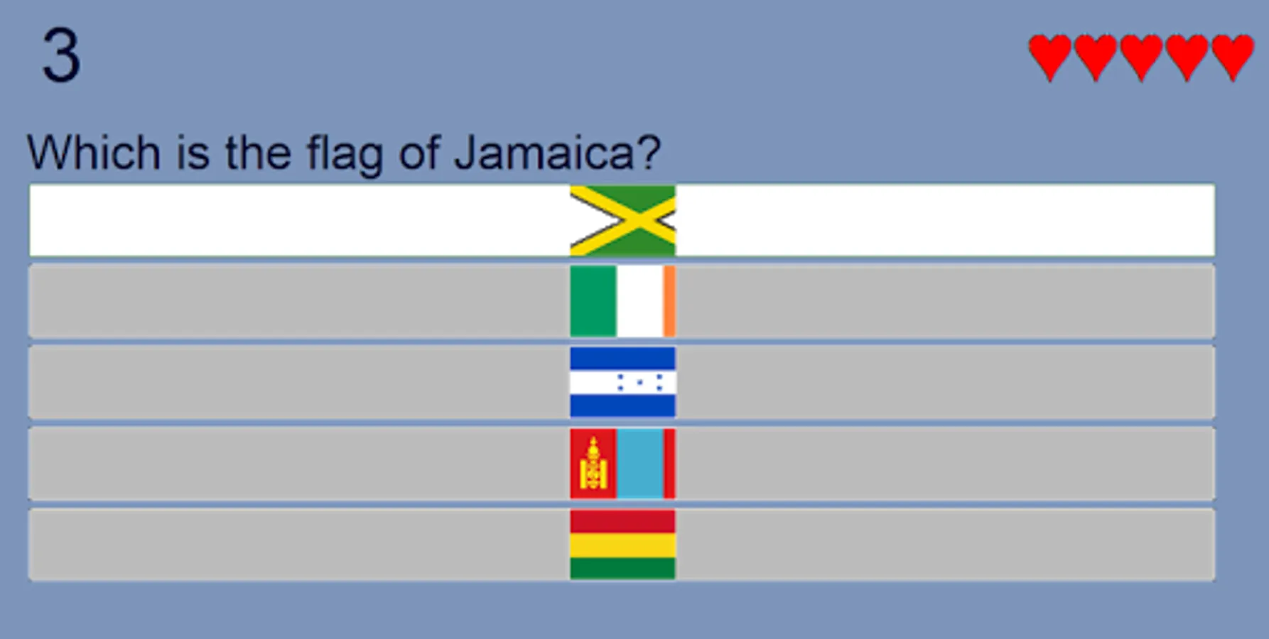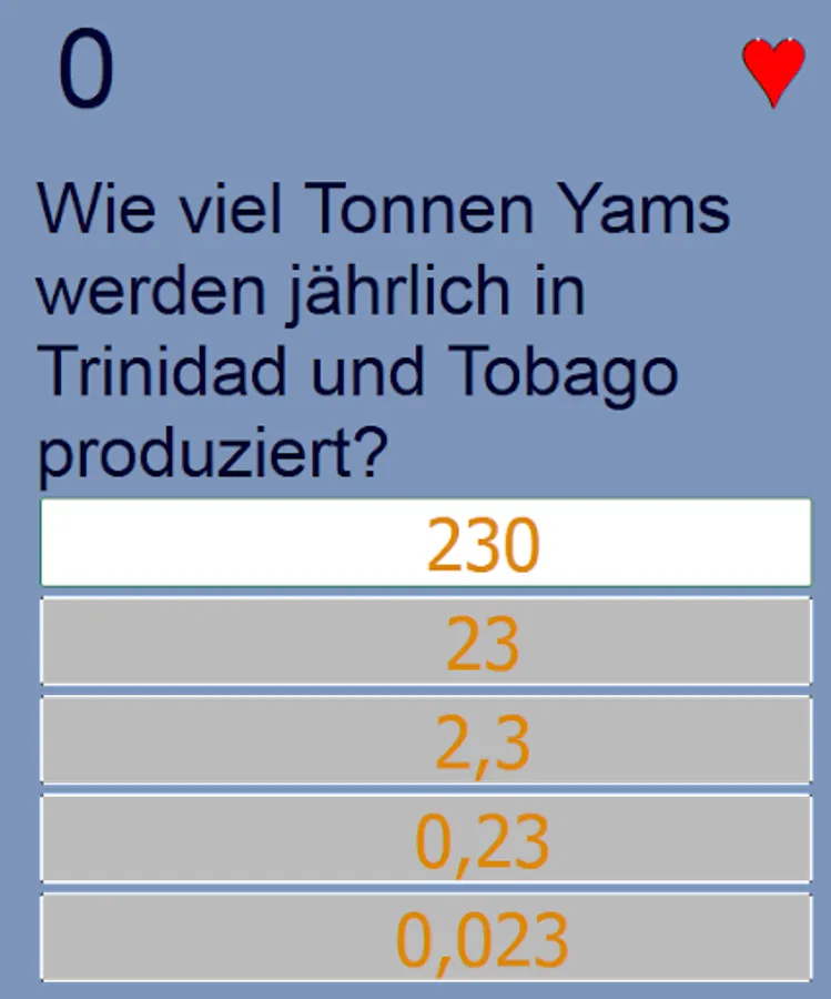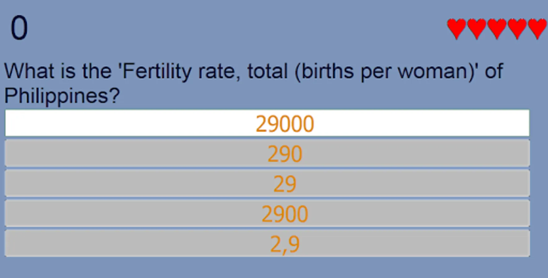 Simple Trivia game in which questions are generated from data of FAO of UN and World Bank data. All data is from 2016. Also, the flags of contries are part of the trivia questions. The app works offline, is free, does not leech your data and is a very small download.