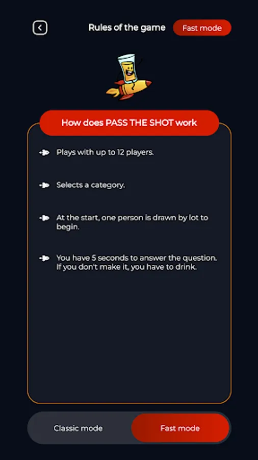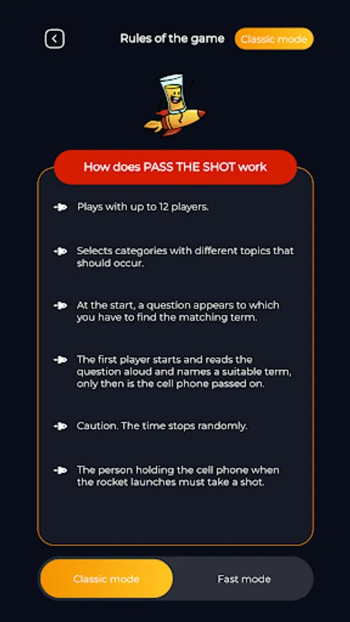 🍺The Pass The Shot party game has two different game modes, ClassicMode and FastMode.