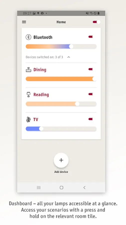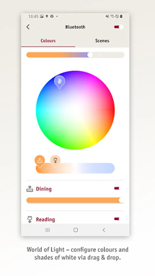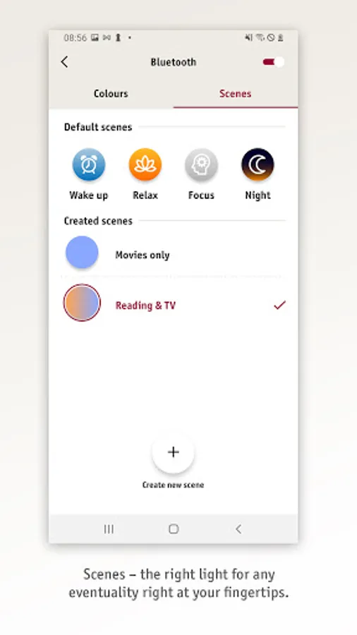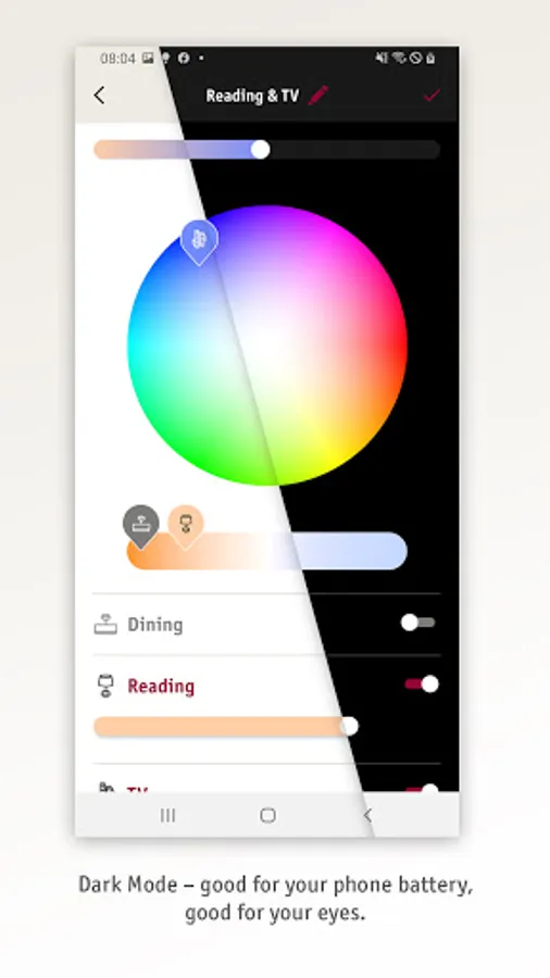 Choose scenarios to match your personal life rhythm: start the day with a warm, soft light or use dimmed feel-good lighting to relax in the evening for some quiet moments. Create your own scenarios for any mood and access them whenever you want. The supported Dark Mode of the app will additionally be kind to your eyes.