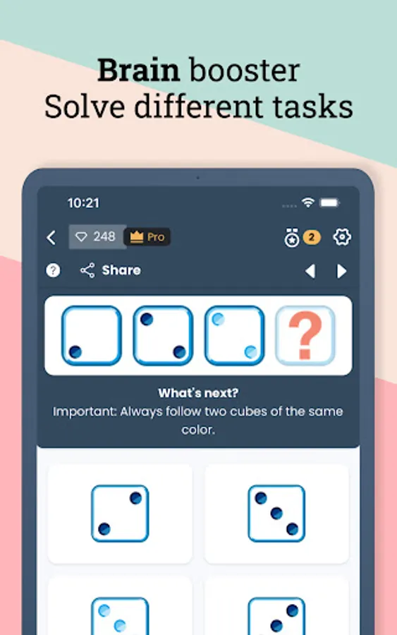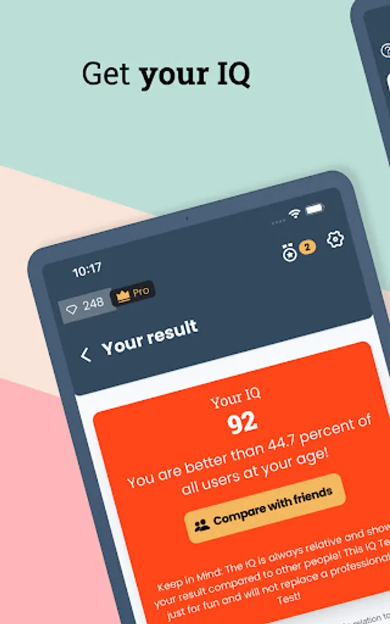 - The Pro Subscription offers you additional IQ Test functions such as explanations, further tests, numerous exercises and much more.
