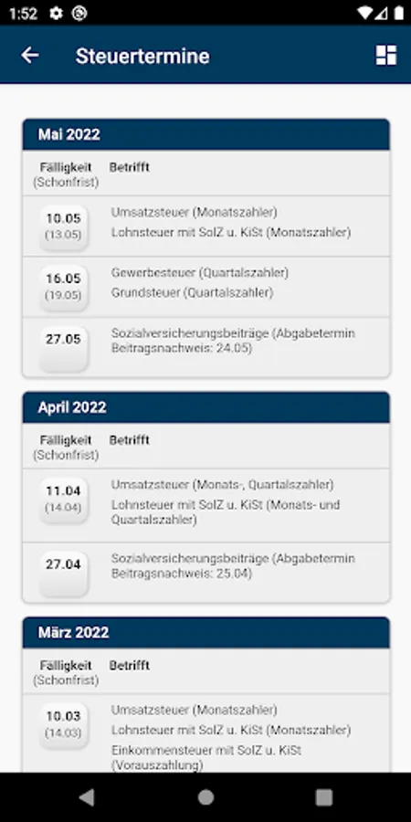 "Until when again the next VAT return must be submitted?", "Which date is valid for the upcoming income tax prepayment '. Both deadlines for filing tax returns as well as the due dates of advance tax payments for the main taxes can be found here.