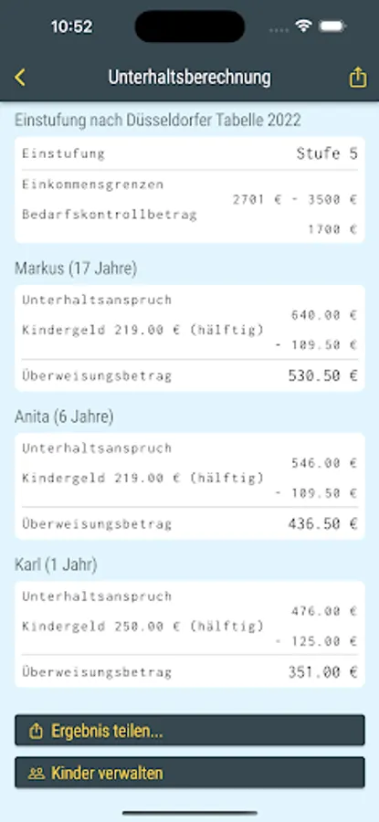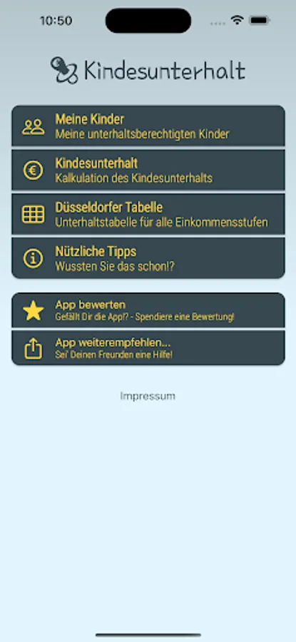 This app is intended to make it easier for you to calculate different maintenance models and to make the subject of calculating child support understandable. You can use your own numbers to calculate various calculation models and thus get an indication of how high child support could be in your personal scenario.