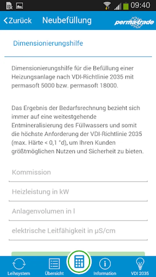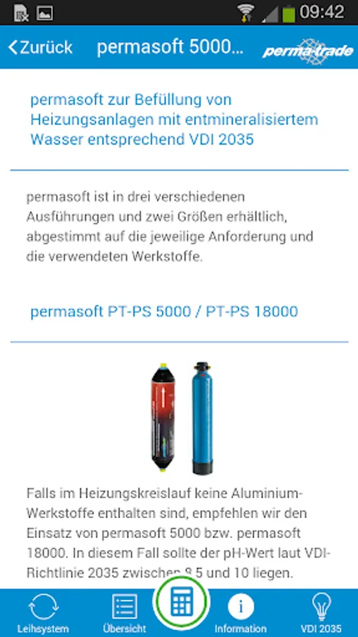 The app also includes information and background on the topics of heating water and VDI 2035 (SWKI BT 102) and the products of perma-trade Wassertechnik GmbH.