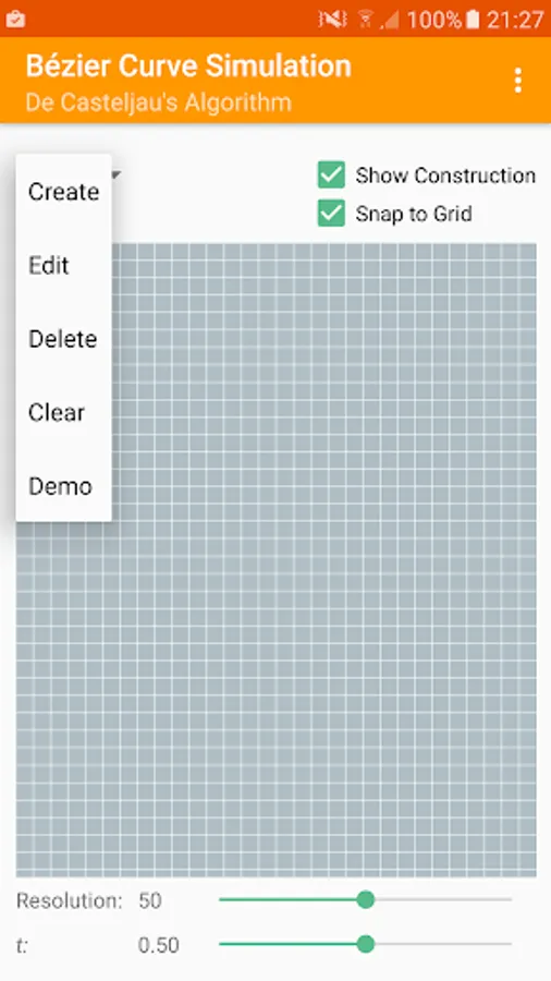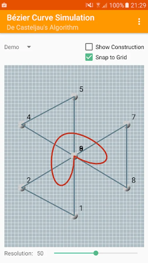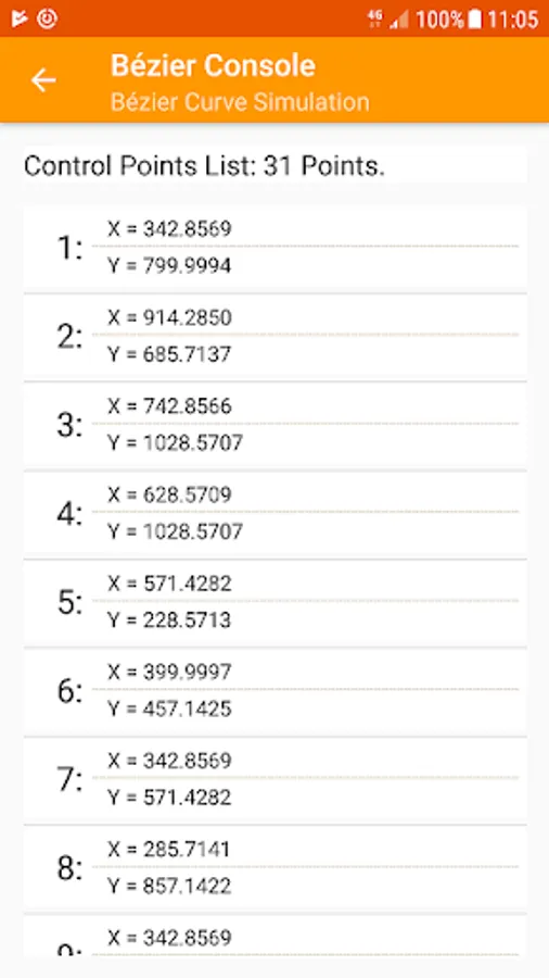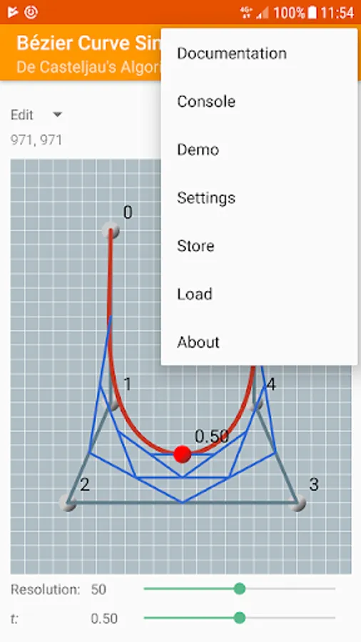 With menu items "Save" and "Load" the current spline is stored in the SharedPreferences the app or restored. The app was further extended by a so-called "Bezier console" (textual representation of the control points).