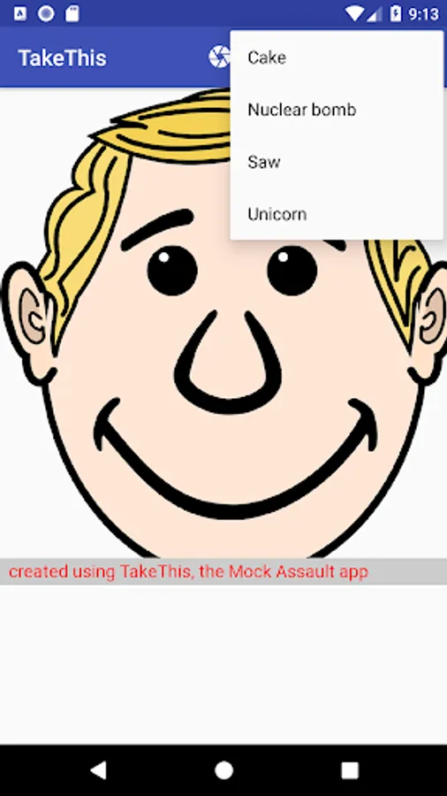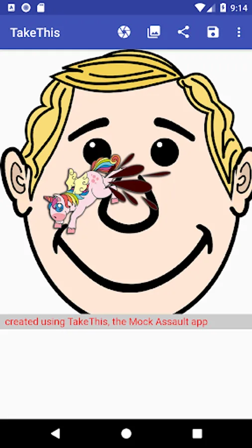 You want to throw Unicorn CENSORED to someone, or even nuke the other one using CENSORED? Now it is quite easy - by using TakeThis! TakeThis can use photos taken by your camera, by grabbing it from your gallery, or simply by using the share function. Once you loaded the image into TakeThis, a toolbox containing several tools is available. Chose one, and tap on the picture to create the effect. The final artwork can be shared, or stored into your gallery.