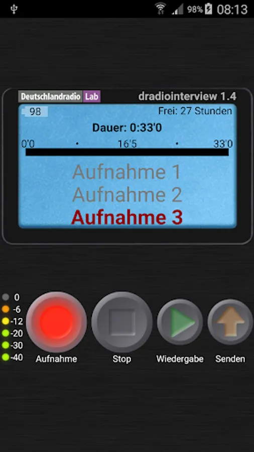 While running in the background, the app records the voice of the interviewee right at the microphone of his cell phone in the course of a mobile phone conversation. Directly after the conversation, the recording will be uploaded to our server and can be accessed immediately via Web download by journalists of Deutschlandradio for further processing.
