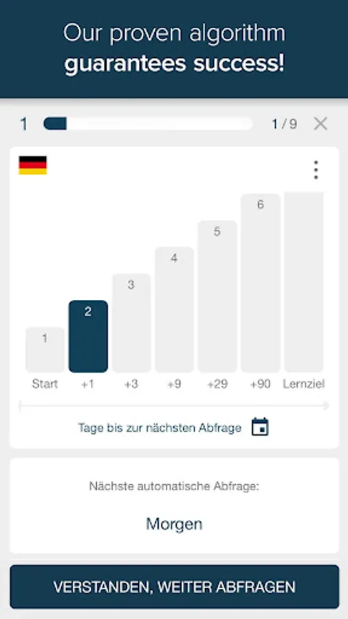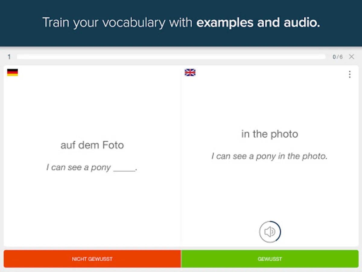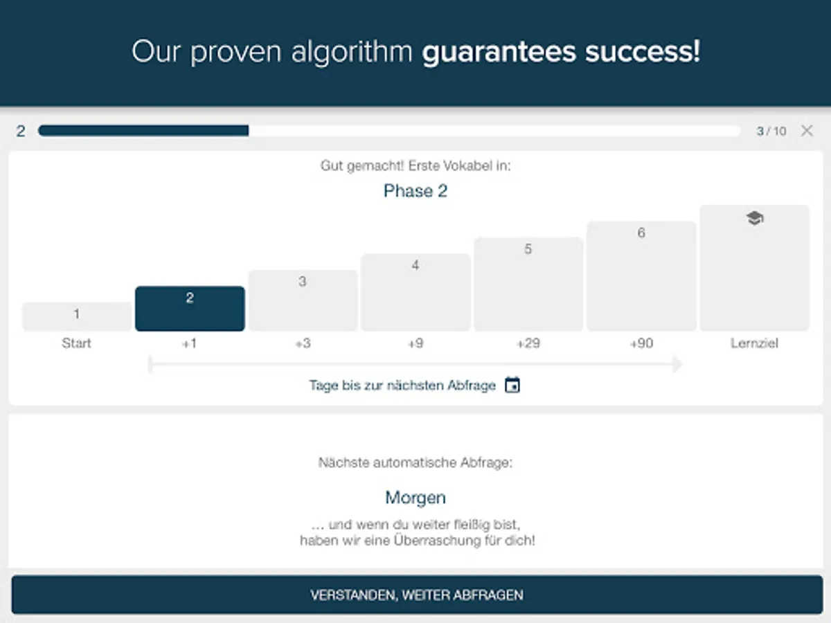 Learning works in a similar way to learning with flashcards. Based on your personal level of knowledge, difficult vocabulary is repeated more often than words that you already know well. The method is scientifically proven and guarantees an optimal language learning process, which is sustainable and efficient at the same time. So you can learn vocabulary quickly and at the same time benefit from sustainable learning success.