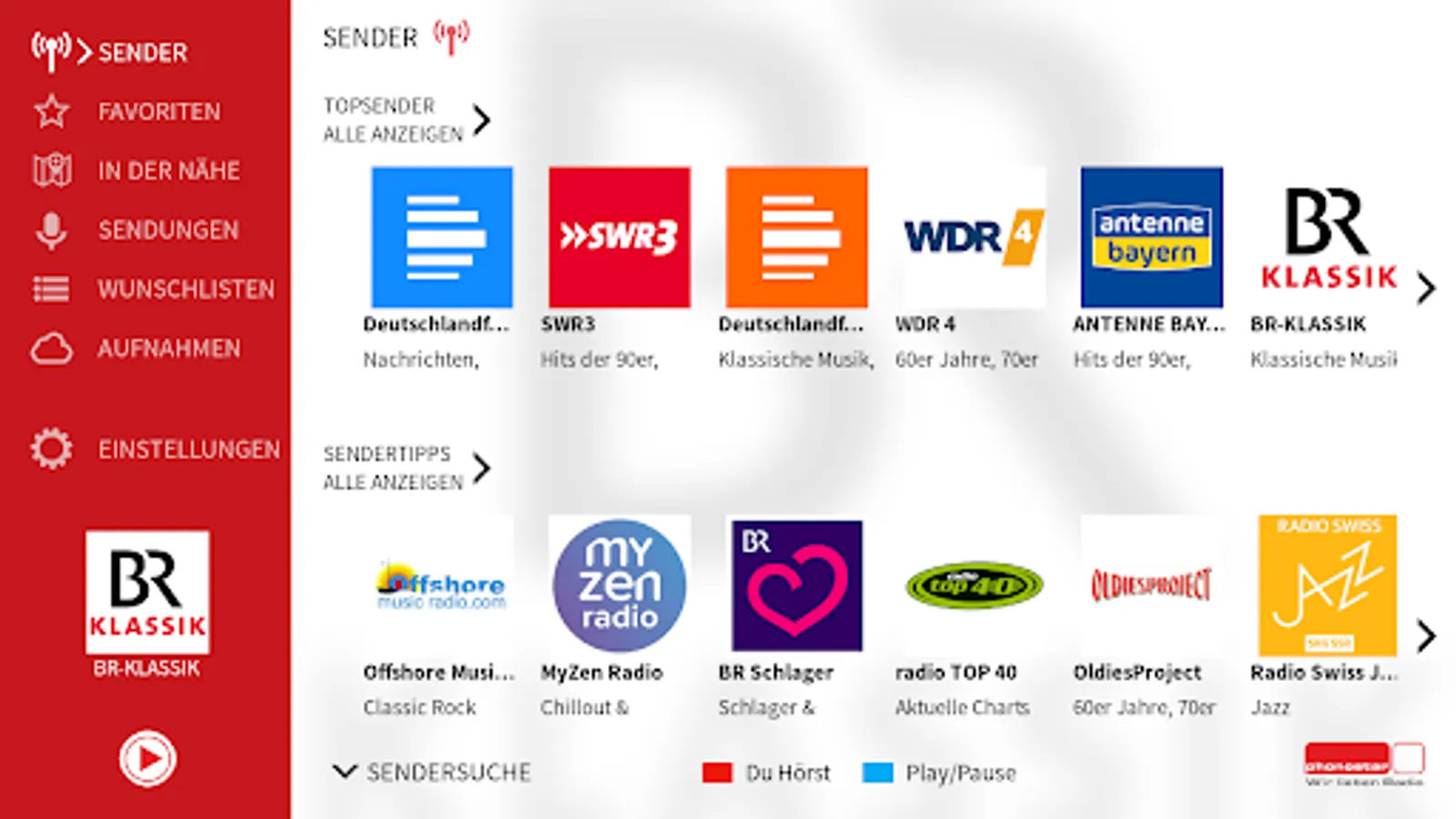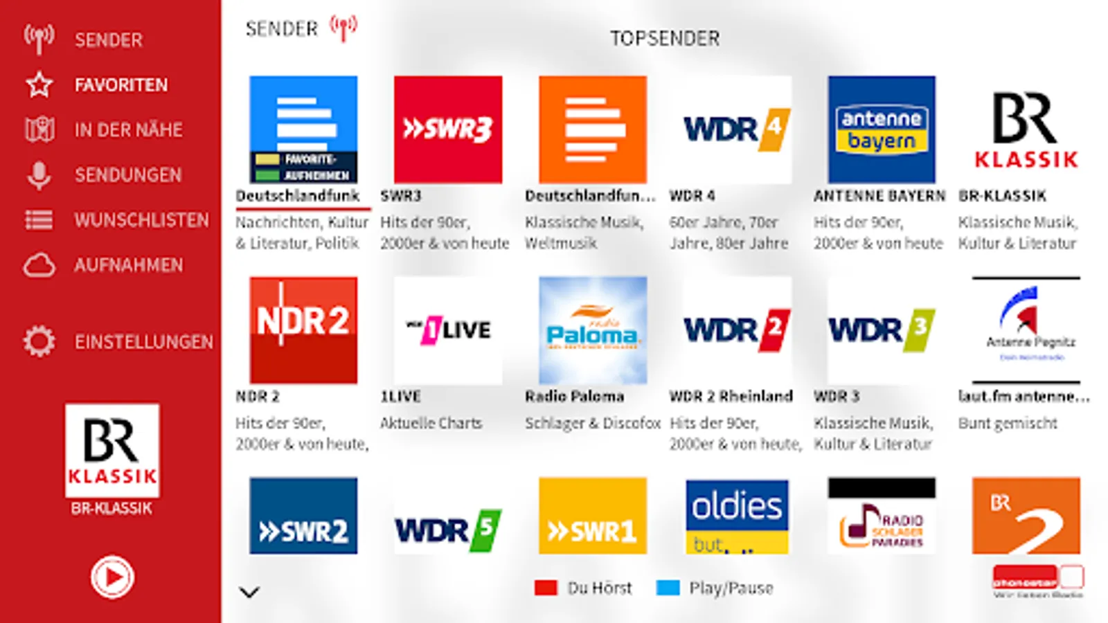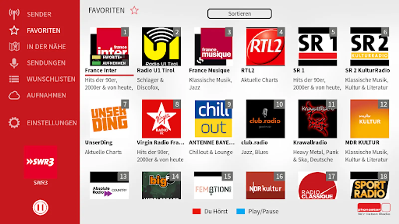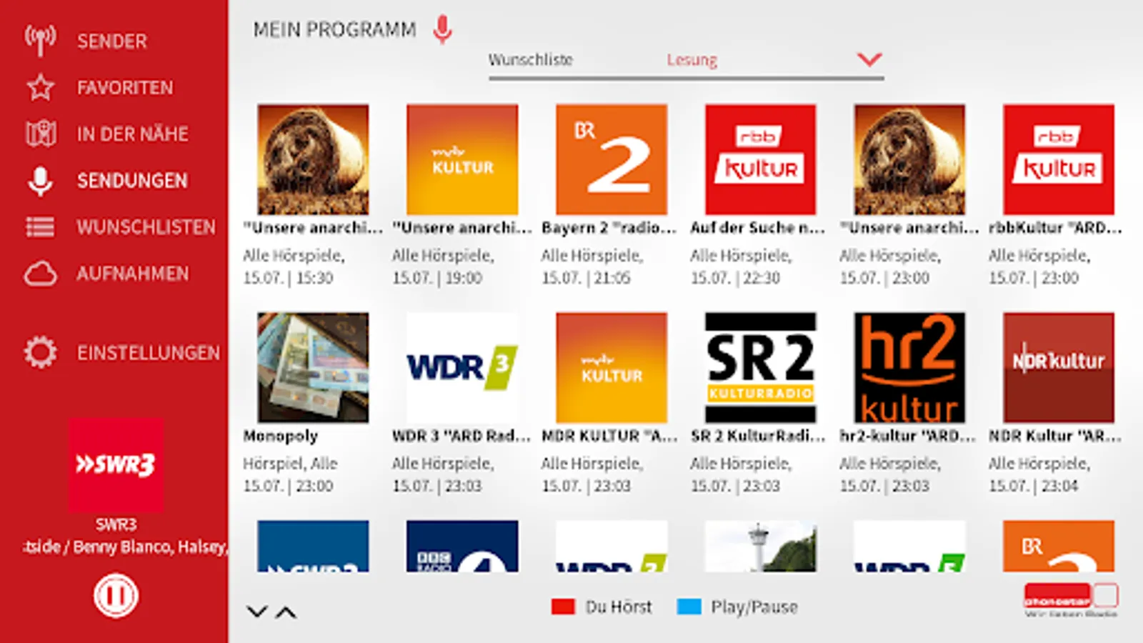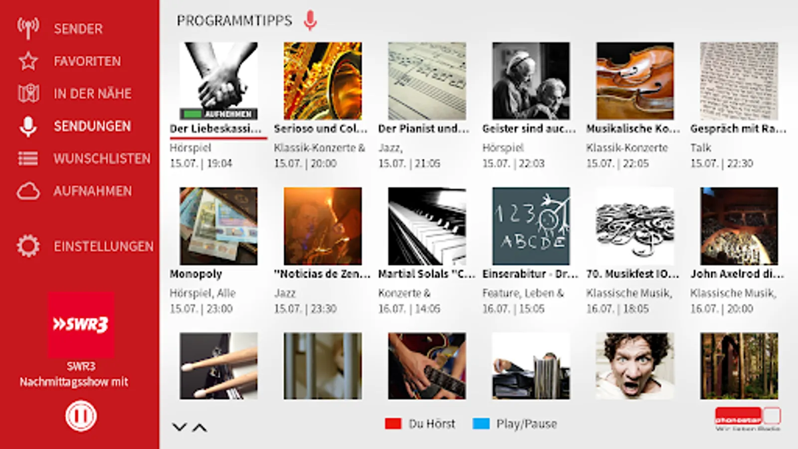 + Program guide: Find more than 15,000 programs daily by keyword and 70 genres, such as radio plays, concerts, music, DJ sets, children or sports