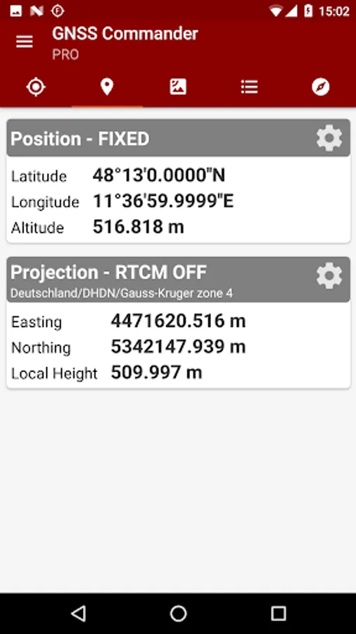 The PPM Commander can transform WGS84 coordinates into a local coordinate system like "Gauß-Krueger or UTM" for germany. Additionally you can set a fixed offset to the transformation for further improvement of the calculated local coordinate. If you allow mock locations in the developer options of your android device you can use the position of the external receiver in any application. The preferred way to process the external GPS position in other apps without using "mock locations" is implementing a simple ContentObserver. You can even get the transformed local coordinate and additional informations about the GPS status by using the app as content-provider.