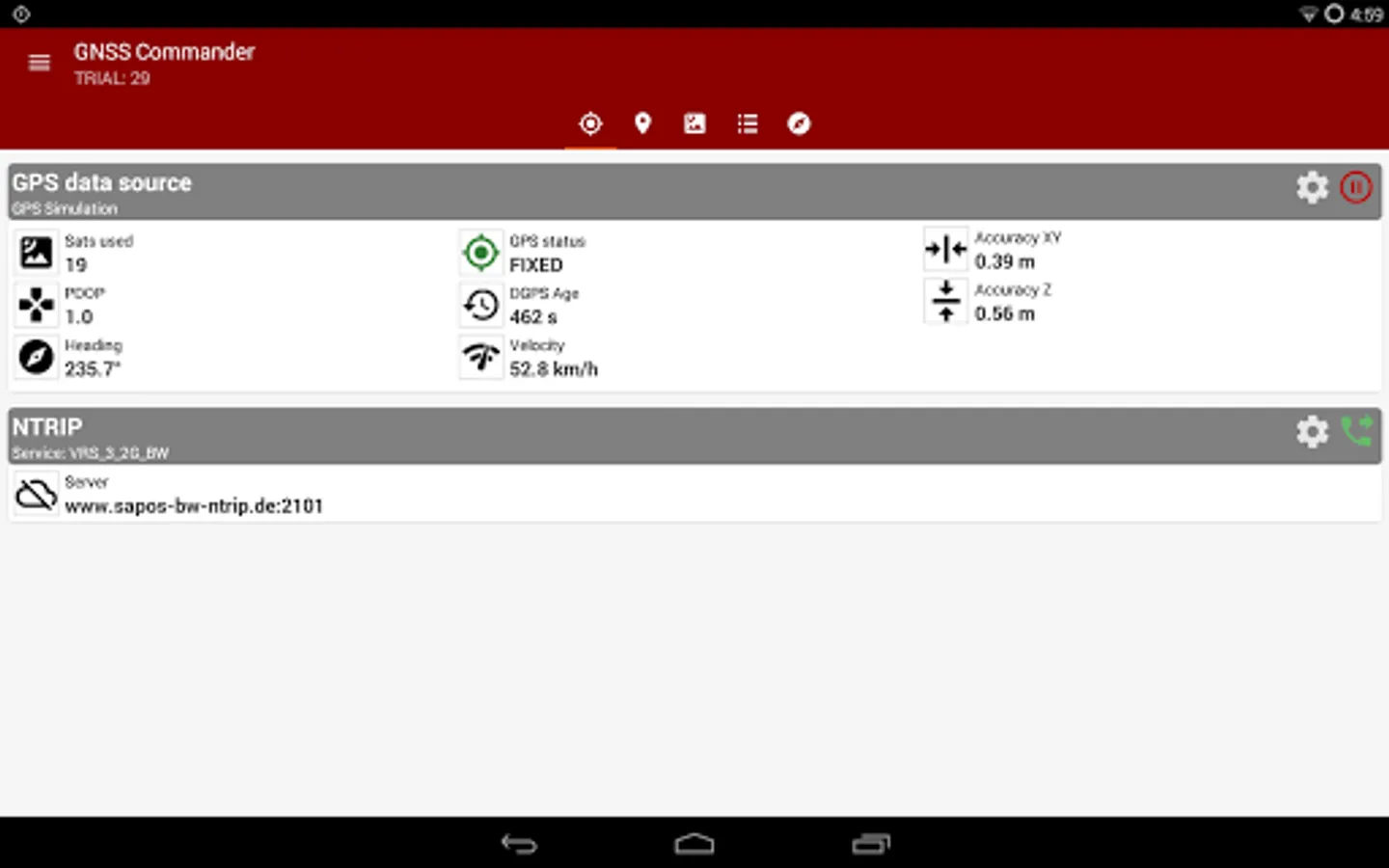 The app ist completely free with the exception of the NTRIP-RTCM feature. If you want to forward RTK data from your data provider (e.g. land surveying office) to the external GPS antenna, please license the app. You can fully test the NTRIP feature in advance within the 30 days trial period. You can view received RTCM message-types and coordinate-projection-parameters of the RTK data on the RTCM monitor page.