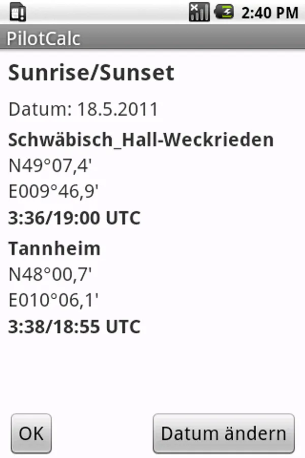 * Display of the sunrise and sunset times for the start and finish on any date (Specification for arbitrary coordinates between 72 ° N and 72 ° S latitude).