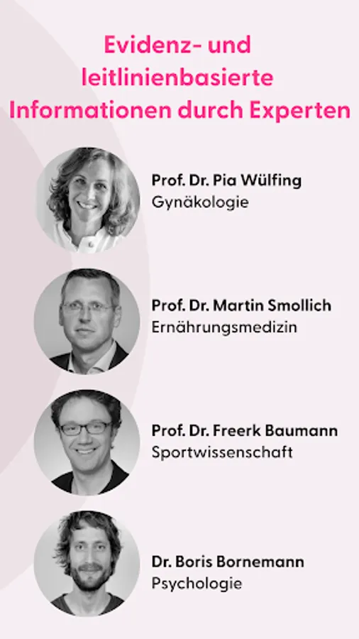 PINK! Coach was specially developed for breast cancer patients and accompanies you during your therapy and aftercare. The holistic concept helps you to get healthy and stay healthy. It was developed by the recognized breast cancer specialist Prof. Dr. Pia Wülfing in cooperation with well-known experts such as Prof. Dr. Nadia Harbeck (Gynaecology, LMU Munich), Prof. Dr. Martin Smollich (Nutritional Medicine, UKSH), Prof. Dr. Freerk Baumann (Sports Science, CIO University Hospital Cologne).