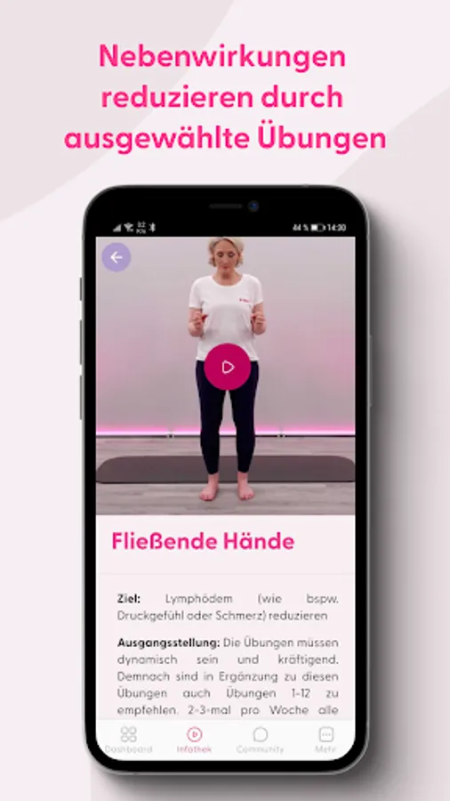 • Exercises for side effects (fatigue, sleep disorders, polyneuropathy, osteoporosis, lymphedema)