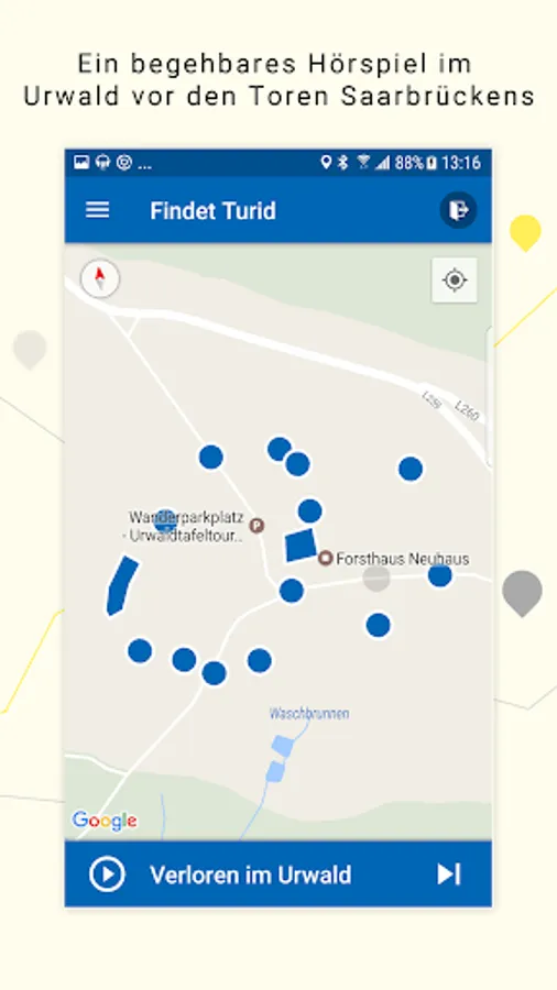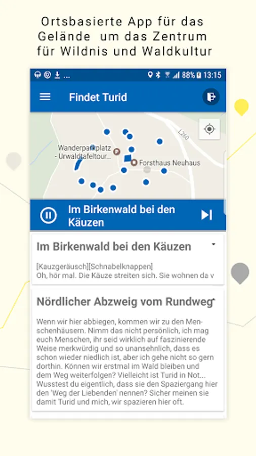 Note: It is a location-based app for the area around the center for wildlife and forest culture in the jungle outside the city Saarbrücken. It only works there.