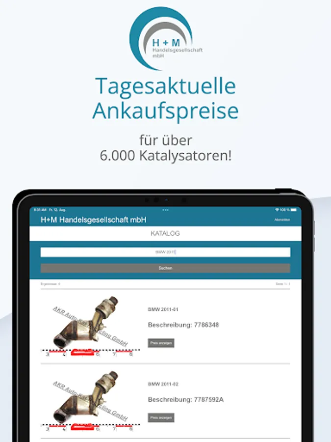 In this H + M catalytic converter application you will find our current purchase prices for over 6,000 catalytic converters. Our data is constantly updated and expanded continuously. With H + M Handelsgesellschaft mbH you have the perfect partner for selling your catalysts. Fast - Reliable - Transparent. With this application we want to offer you maximum transparency. In contrast to other providers, we trust our data and buy your catalysts at these prices. We don't have to wait long for a non-transparent analysis result. H + M Handelsgesellschaft mbH - Success is no coincidence.