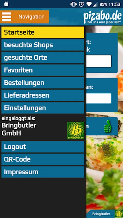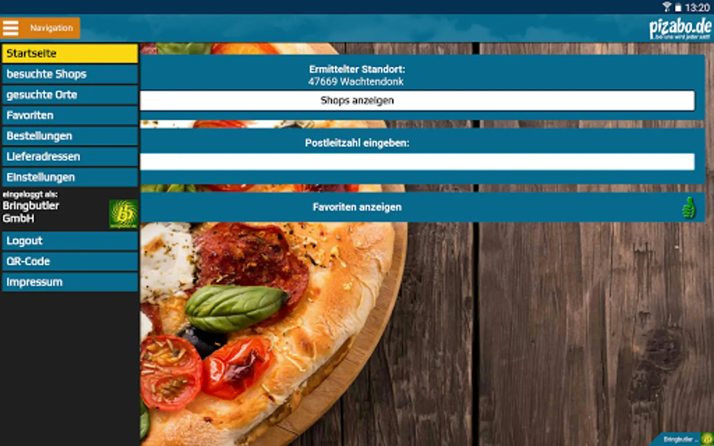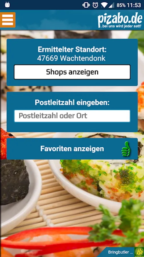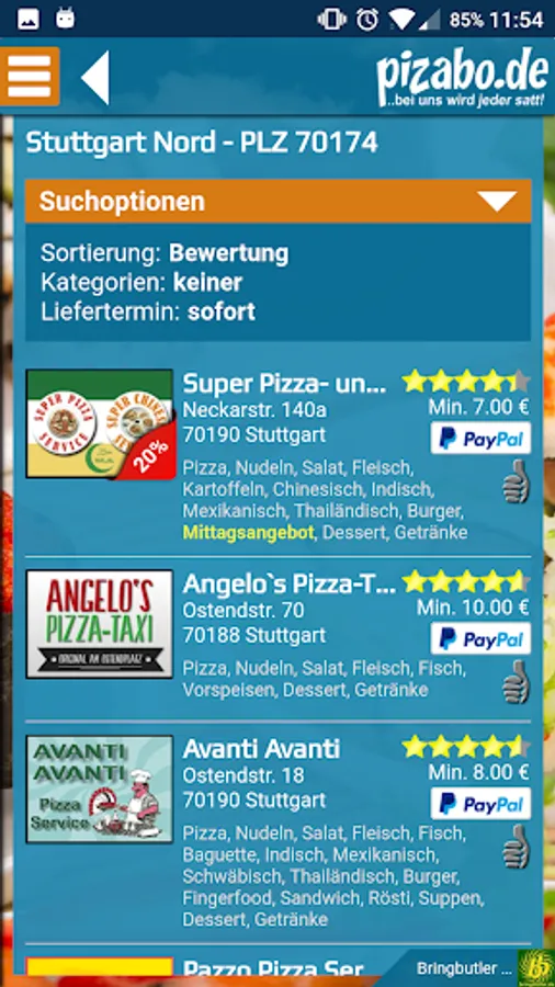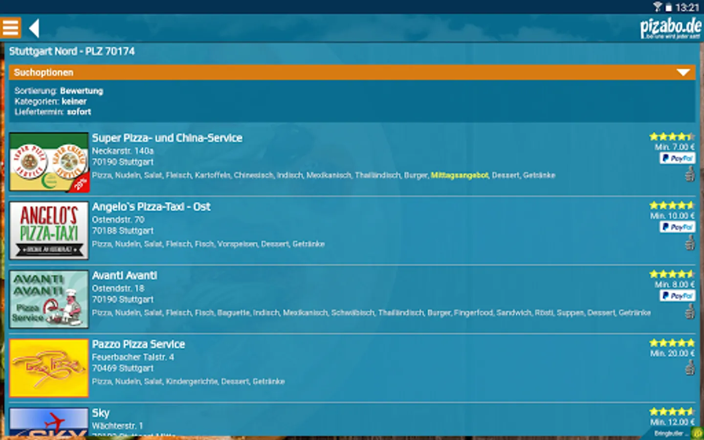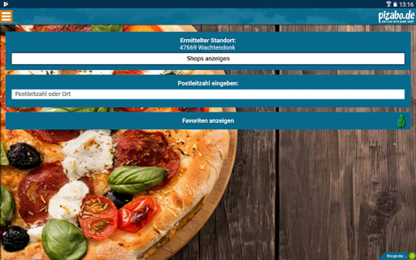 The Pizabo app detects your location automatically or enter your location or its postal code. Already all delivery services are presented which will supply or where you can pick up the food.