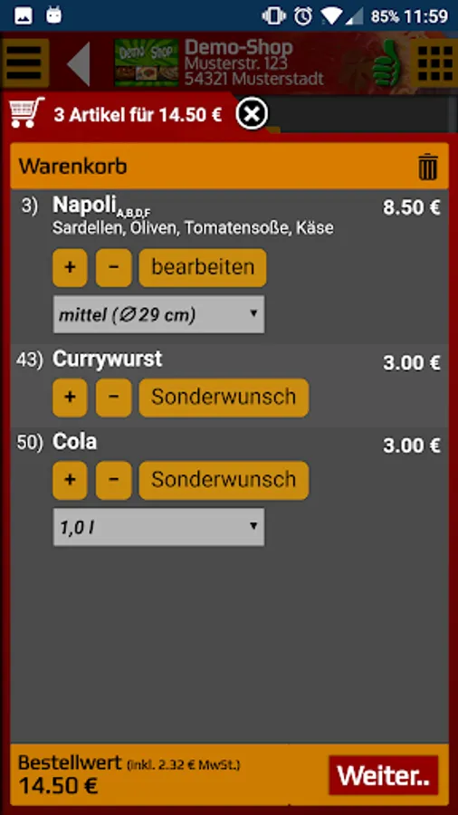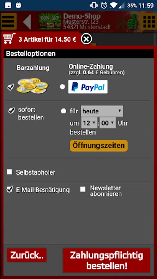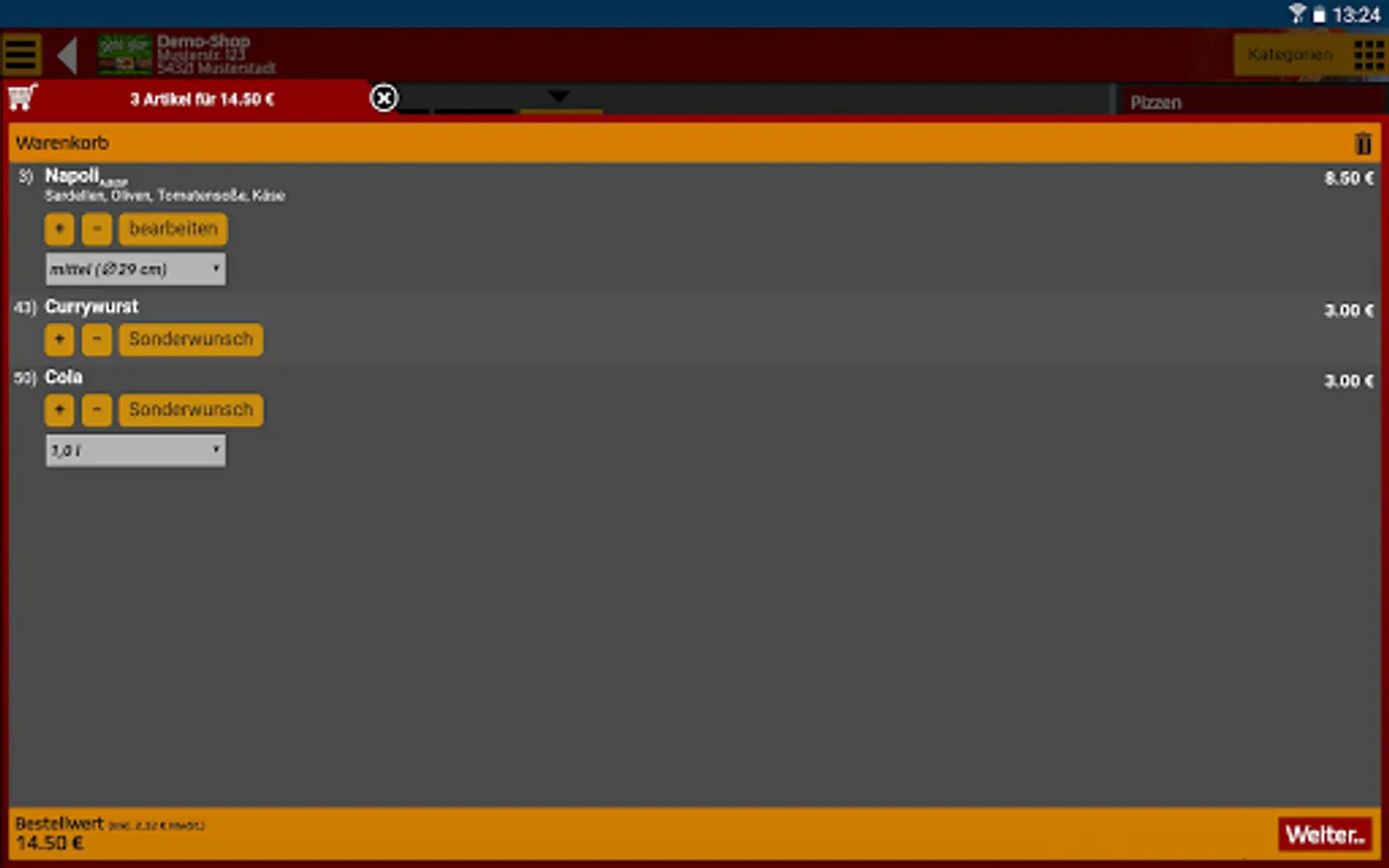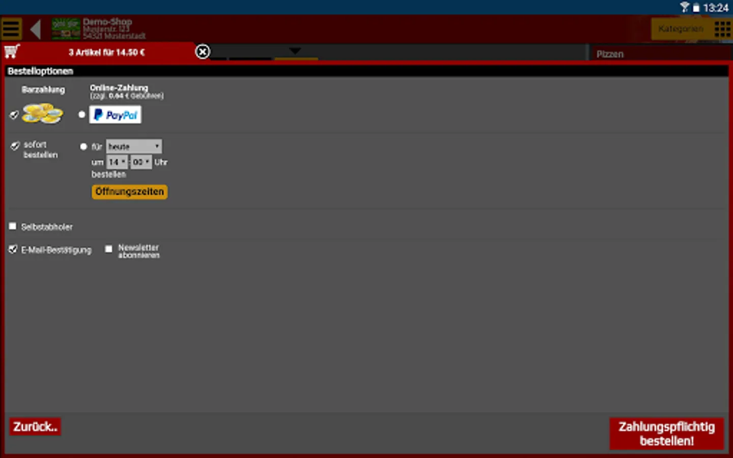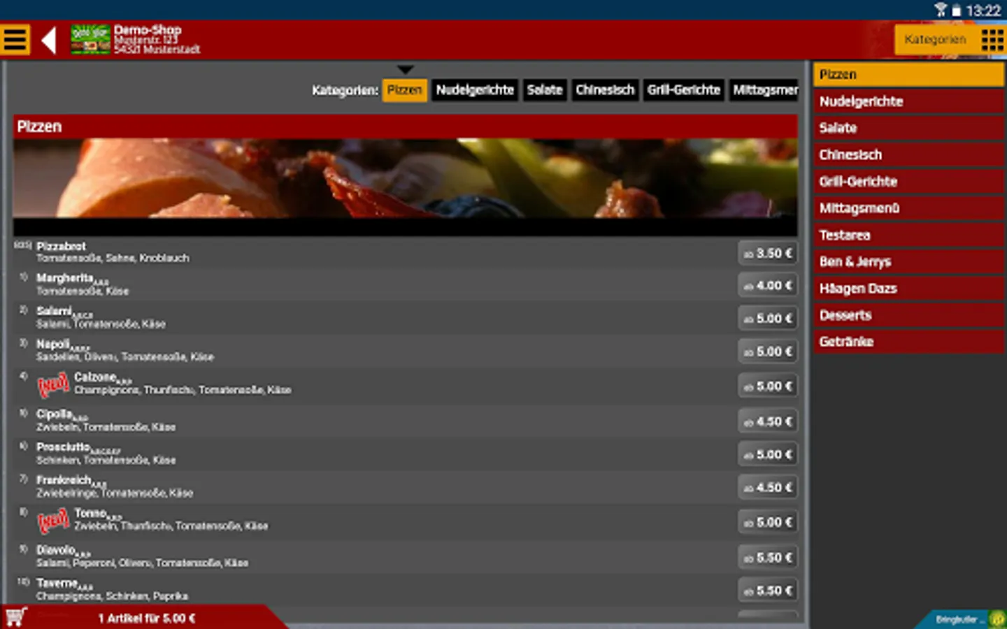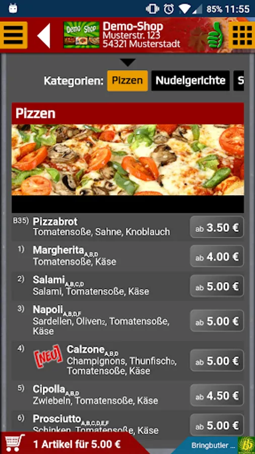 The Pizabo app detects your location automatically or enter your location or its postal code. Already all delivery services are presented which will supply or where you can pick up the food.