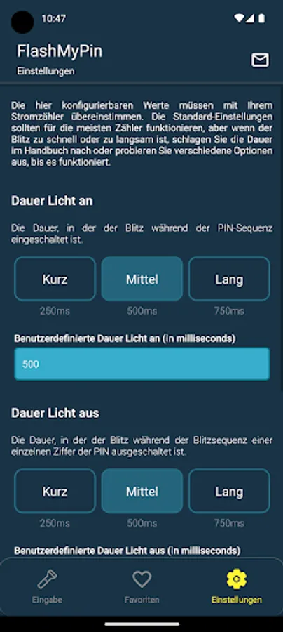 Modern electricity meters require entering a PIN using a flashlight. One must then enter the various digits in the form of flashing signals using a Morse-like code. One flash corresponds to a One, two flashes correspond to a Two, and so on. This can be very time-consuming and error-prone. Additionally, errors can easily happen during this form of input due to the importance of the correct timing.nnFlashMyPin is the solution: instead of manually entering individual flashing signals using a flashlight, one simply types in their PIN and the flashlight on their phone camera flashes in the correct pattern. All that's left to do is to hold the phone up to the light sensor on the smart meter, and the PIN will be entered in no time.nnMake your life easier and use FlashMyPin!