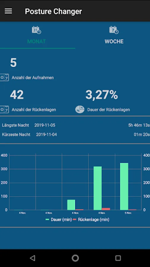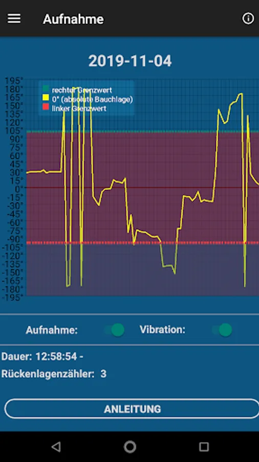 The supine position during sleep is particularly problematic for snoring and apnea patients. From a scientific point of view, sleeping in a supine position increases the narrowing of the upper respiratory tract due to the slackened muscles. This usually leads to a pronounced snoring and apnea behaviour. Avoiding the supine position can therefore be helpful for those affected. This app can help to analyse the personal sleeping positions and correct them if necessary. With the help of the vibration function, a jerky wake-up is avoided and instead a gentle change in sleeping position is stimulated. Regular use of the app can be useful for targeted sleeping position training.