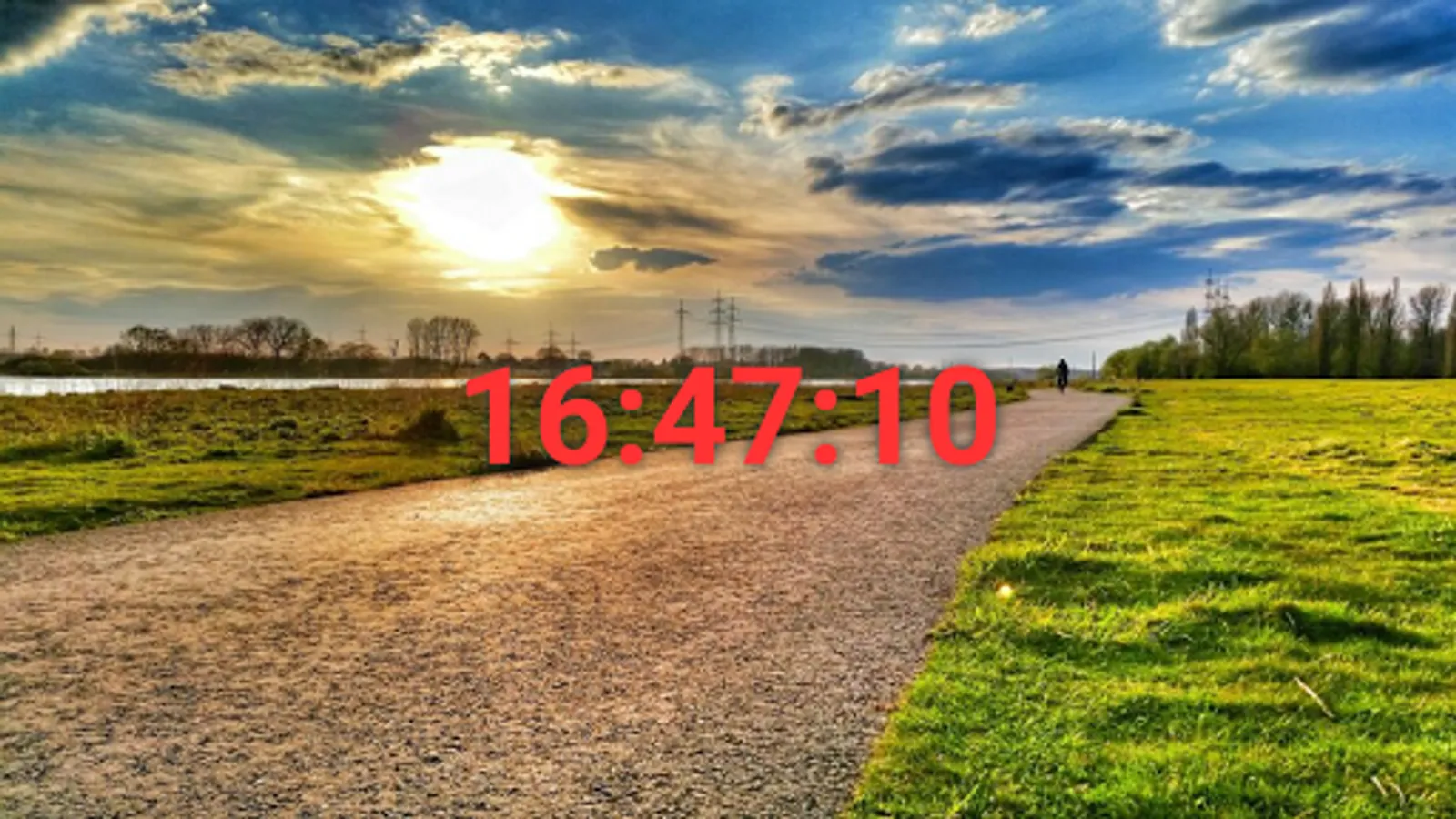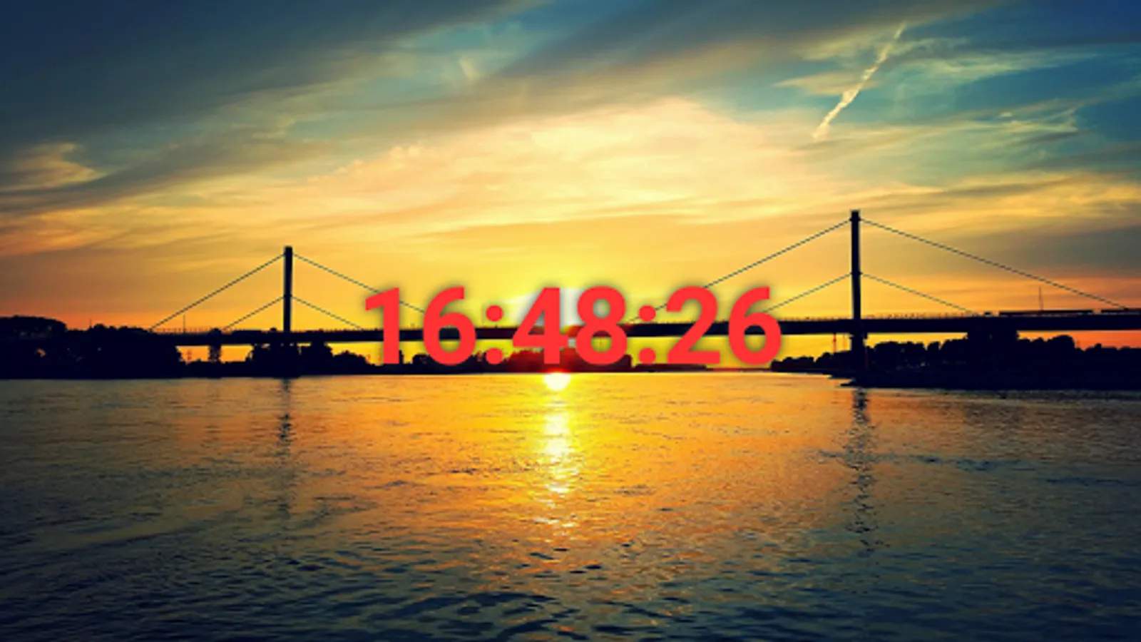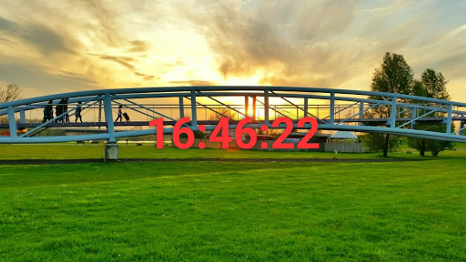 A digital clock in 24-hour format with changing images from Leverkusen in the background.