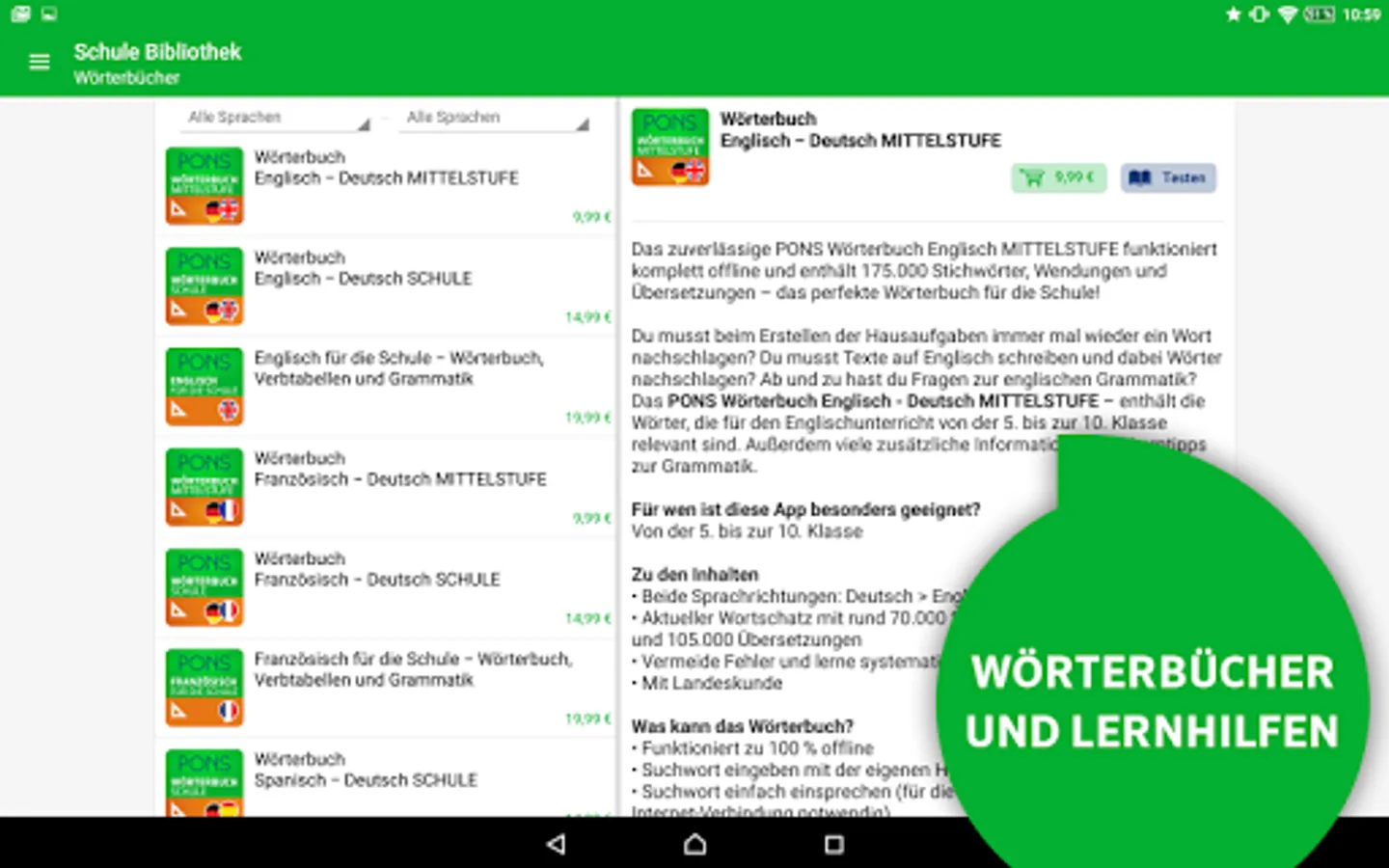 The PONS School Library contains dictionaries, verb tables and learning aids for English, French, German, Latin and Spanish.
