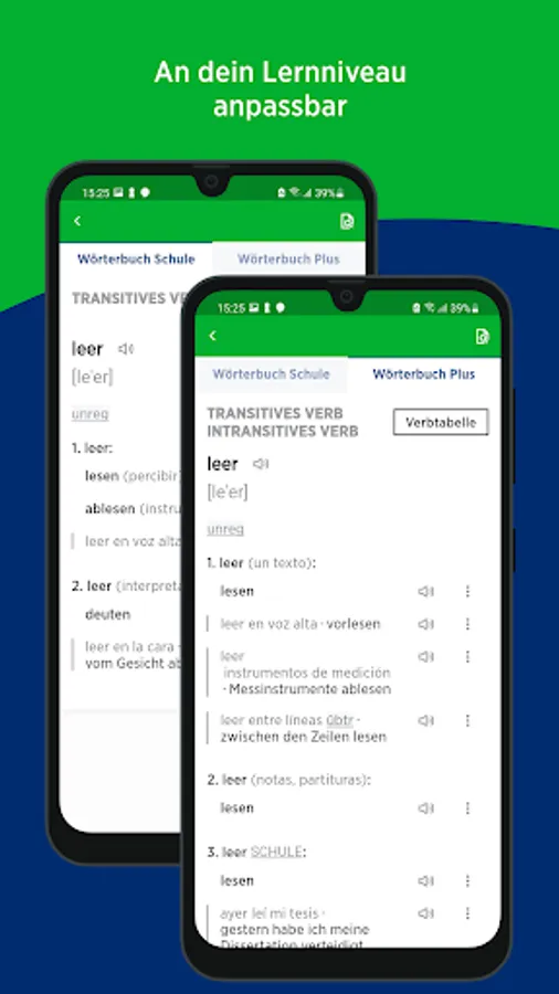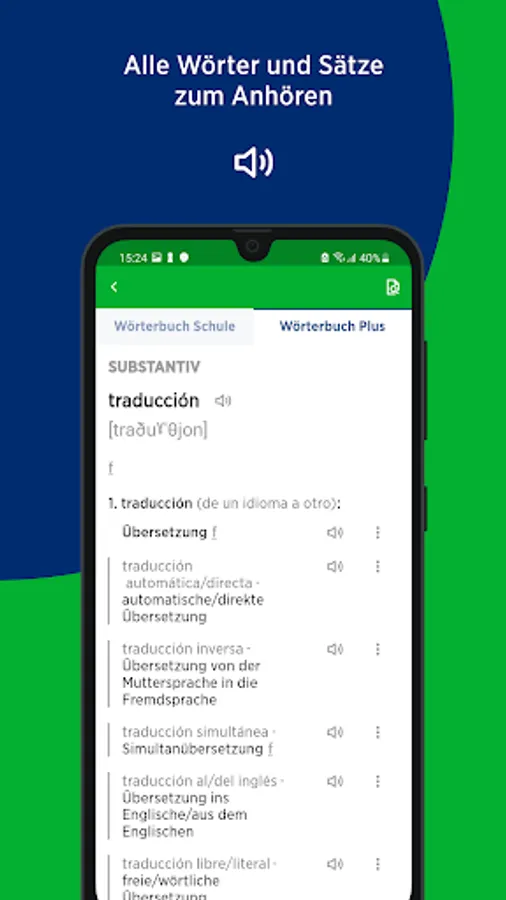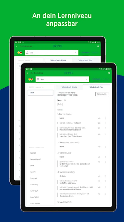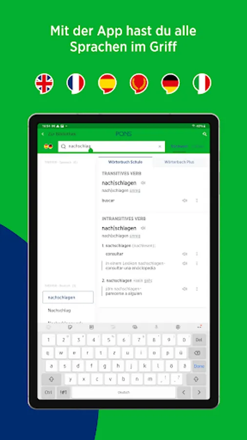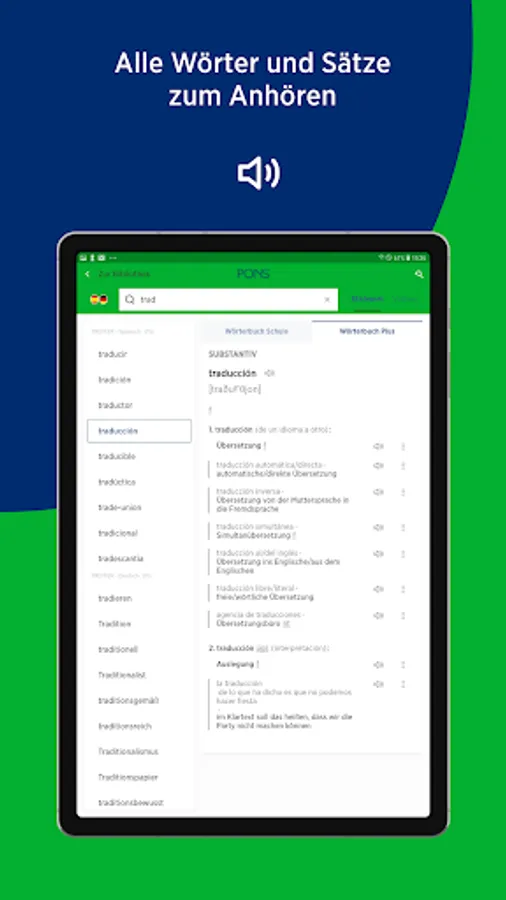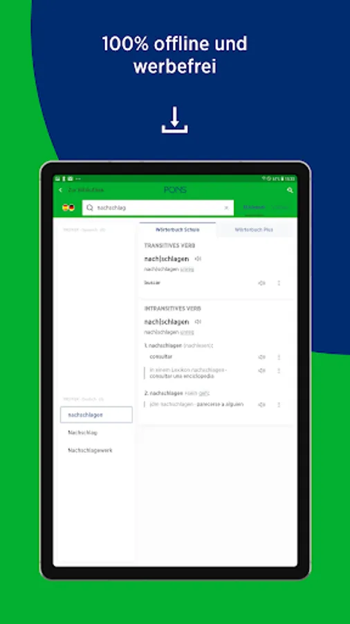 Finding the right translation is not difficult: The PONS app for schools accompanies you from the 5th grade to graduation and contains the vocabulary that you really need at school. Numerous context examples and idioms show you the correct use of language. The perfect help in class and at home with your homework!