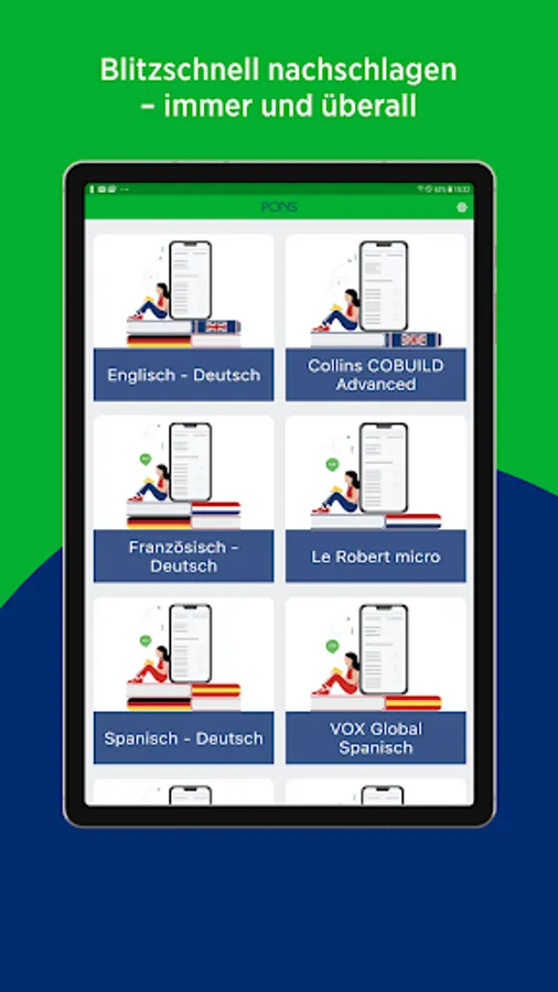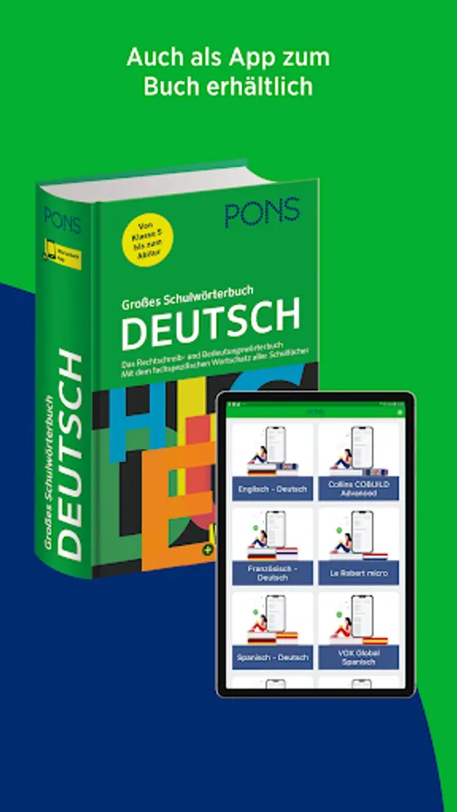 Did you buy a PONS dictionary for school in a bookstore? You can redeem your code from the book at www.pons.com/code-aktivieren. Then download the app for free. Your dictionary is available for download in the app after logging in.