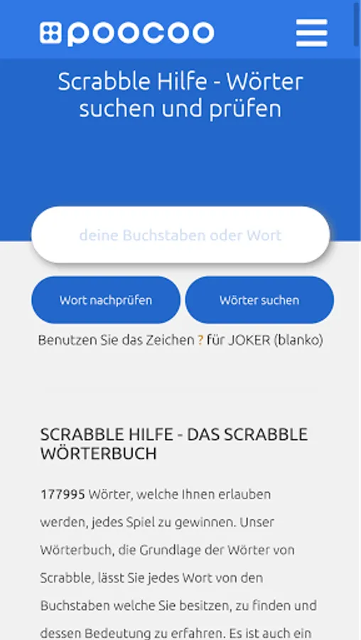 177995 words that will allow you to win every game. Our dictionary, the foundation of Scrabble words, lets you find each word and its meaning by the letters you have. It is also an anagrammator, a program tool that allows you to create anagrams.