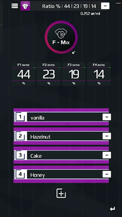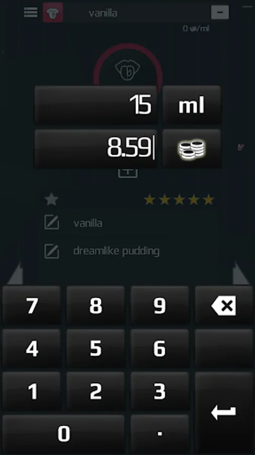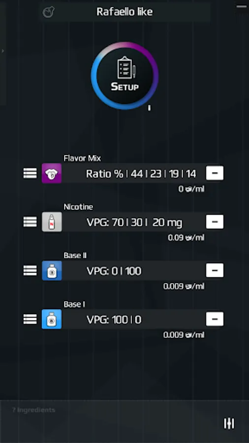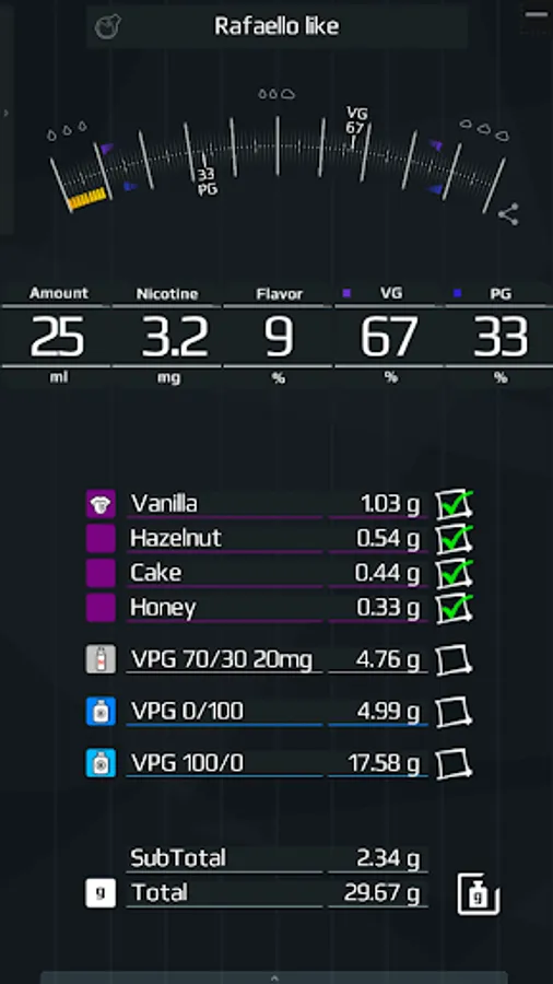So that's what I've come up with, a cybernetics system that instantly displays the results in ml or grams. Based on your fixed and possible settings of VPG/nicotine input along with variations of editable ingredients.