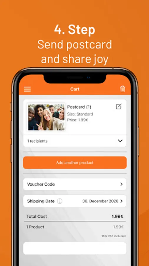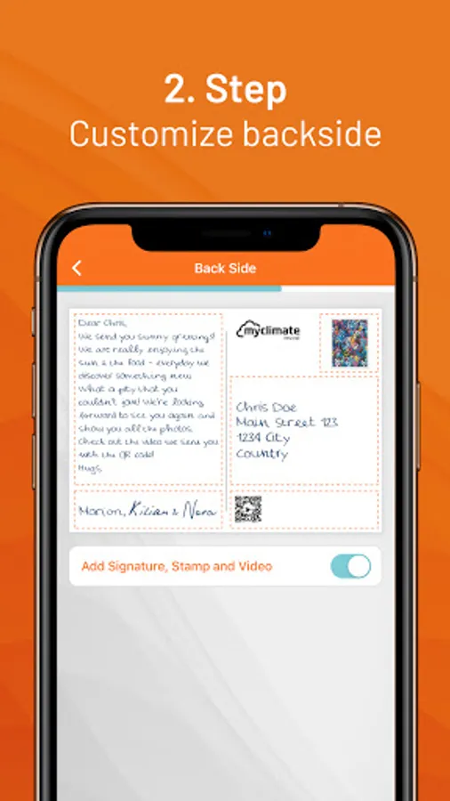 Furthermore, you have the possibility to put even more liveliness into your creation by adding a video. Special feature: Let the sender know that you received the postcard by only scanning the QR-Code.