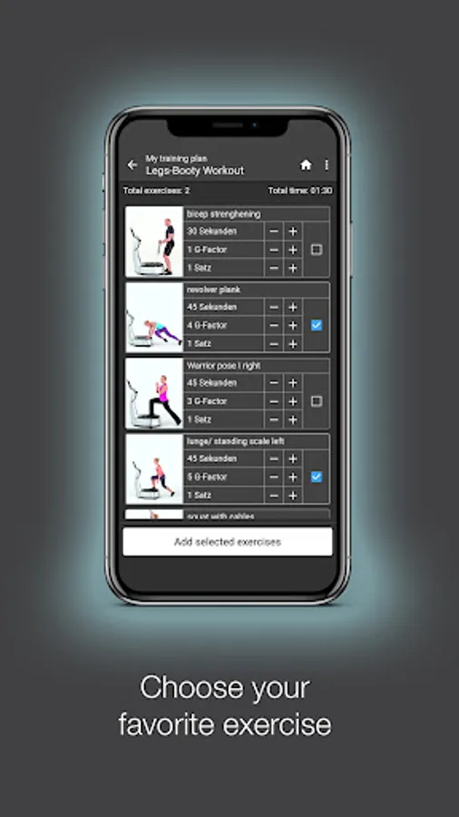 You, of course, also have the option to establish and adjust the exercises in the training plan yourself. You can select from over 1,000 exercises and can individually select exercises to put together a 20-minute training session. For each individual exercise, you can adjust the training time (30-45-60 seconds), the intensity (1-8 G), and the number of repetitions (1-2 times). In this way you build your own individual training program, which you can always come back to. These training programs are always alterable, and you even have the ability to access your training programs in the offline mode.