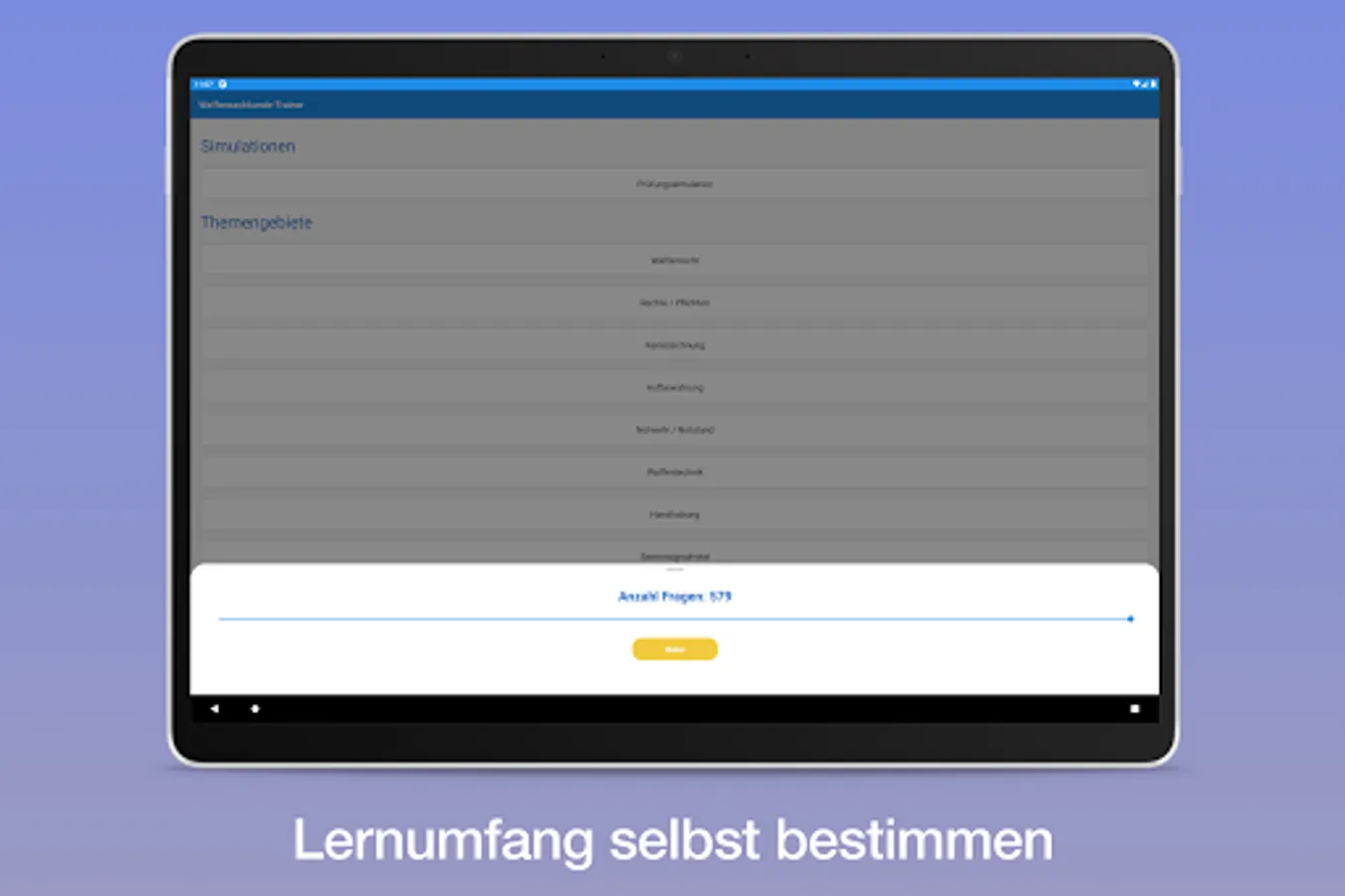 - Number of questions are freely selectable - Only little time? The workload itself can be selected, depending on how much time is available.