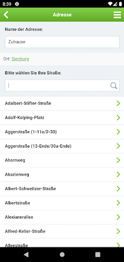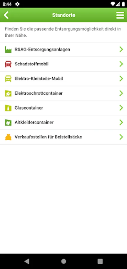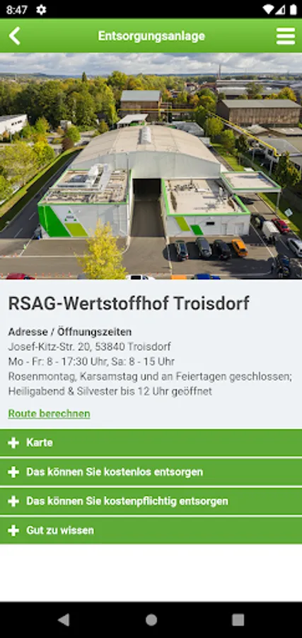 You have direct access to all opening hours and addresses of the RSAG disposal facilities with an additional navigation function.