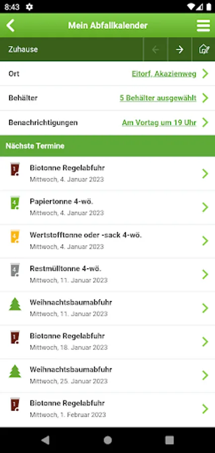 With RSAG's digital waste calendar, you won't miss any more emptying dates. Simply enter the city and street and you will be reminded of every collection. The dates of the pollutant and small electrical parts mobile are also displayed. Or you can call up the locations of glass containers, used clothing containers or electronic waste containers in your area.