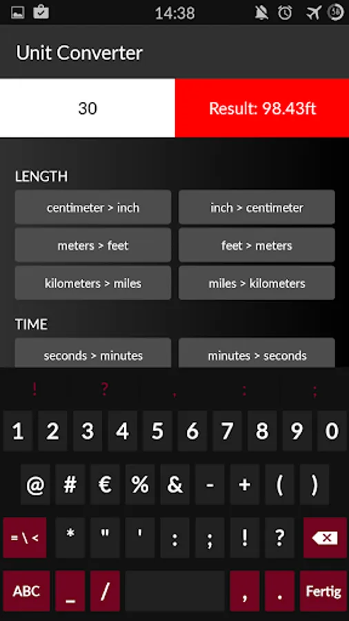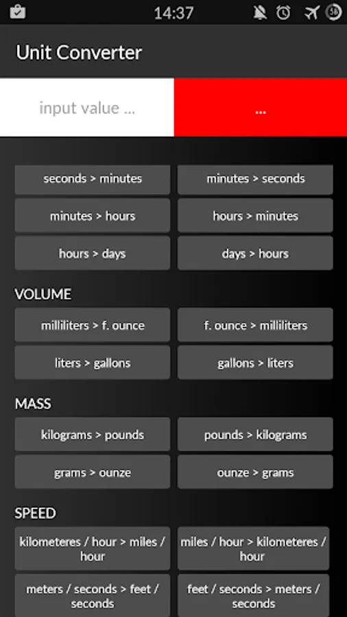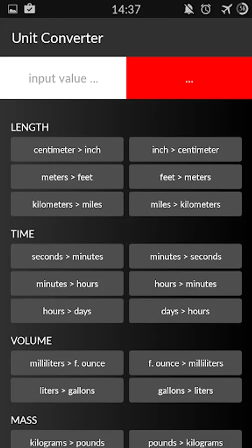 This app allows you to convert units. You can convert: centimeter to inch, inch to centimeter, meters to feet, feet to meters, kilometers to miles, miles to kilometers, seconds to minutes, minutes to seconds, minutes to hours, hours to minutes, hours to days, days to hoursm milliliter to fluid ounce, fluid ounce to milliliters, liters to gallons, gallons to liters, kilograms to pounds, pounds to kilograms, grams to ounce, ounce to grams, kilometers per hour to miles per hour, miles per hour to kilometers per hour, meters per second to feet per second, feet per second to meters per second.