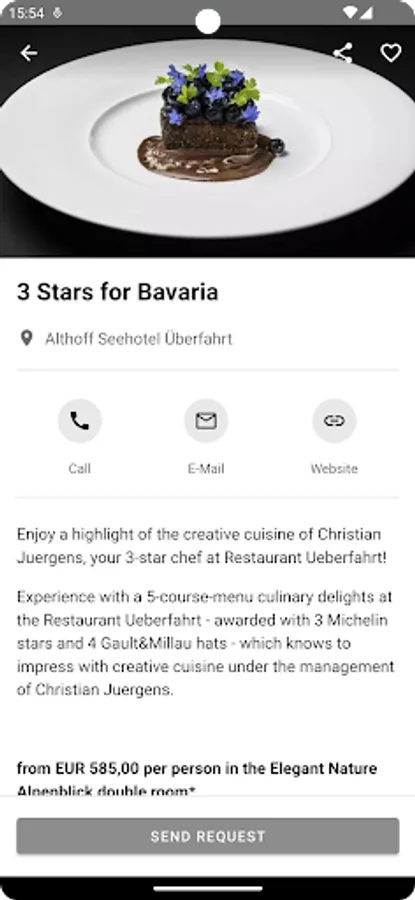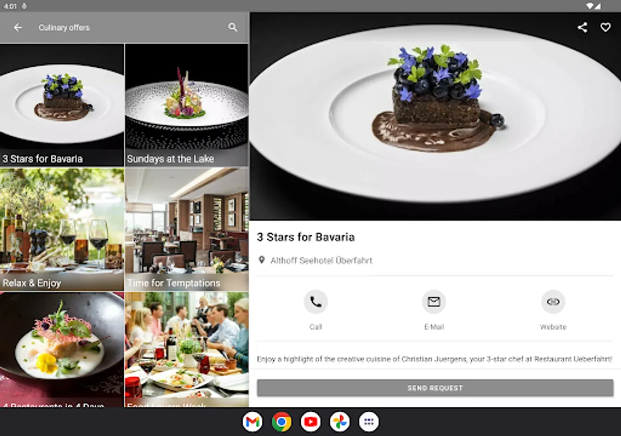 5 Restaurants at Lake Tegern. Unique location meets unique culinary - awarded 1st place in the category "Gourmet Hotels 2021" by the Connoisseur Circle! Find out more about the culinary offers. Our menus are digitally stored in the Seehotel Überfahrt App.