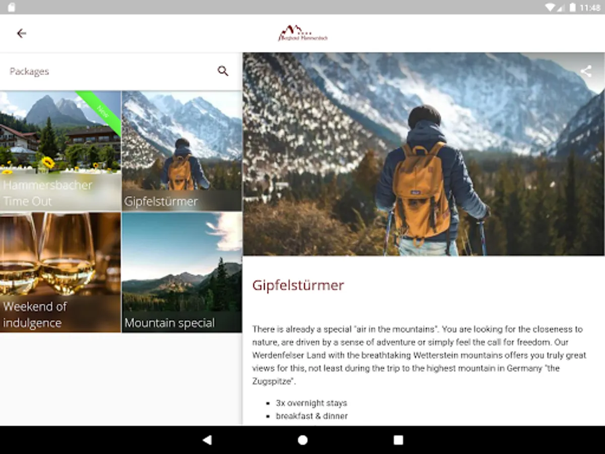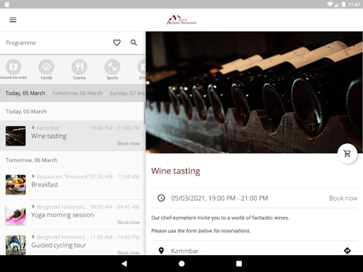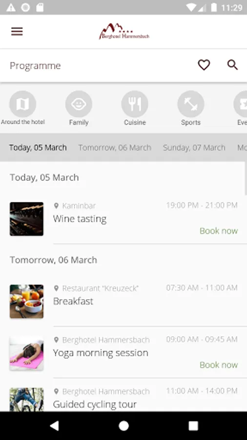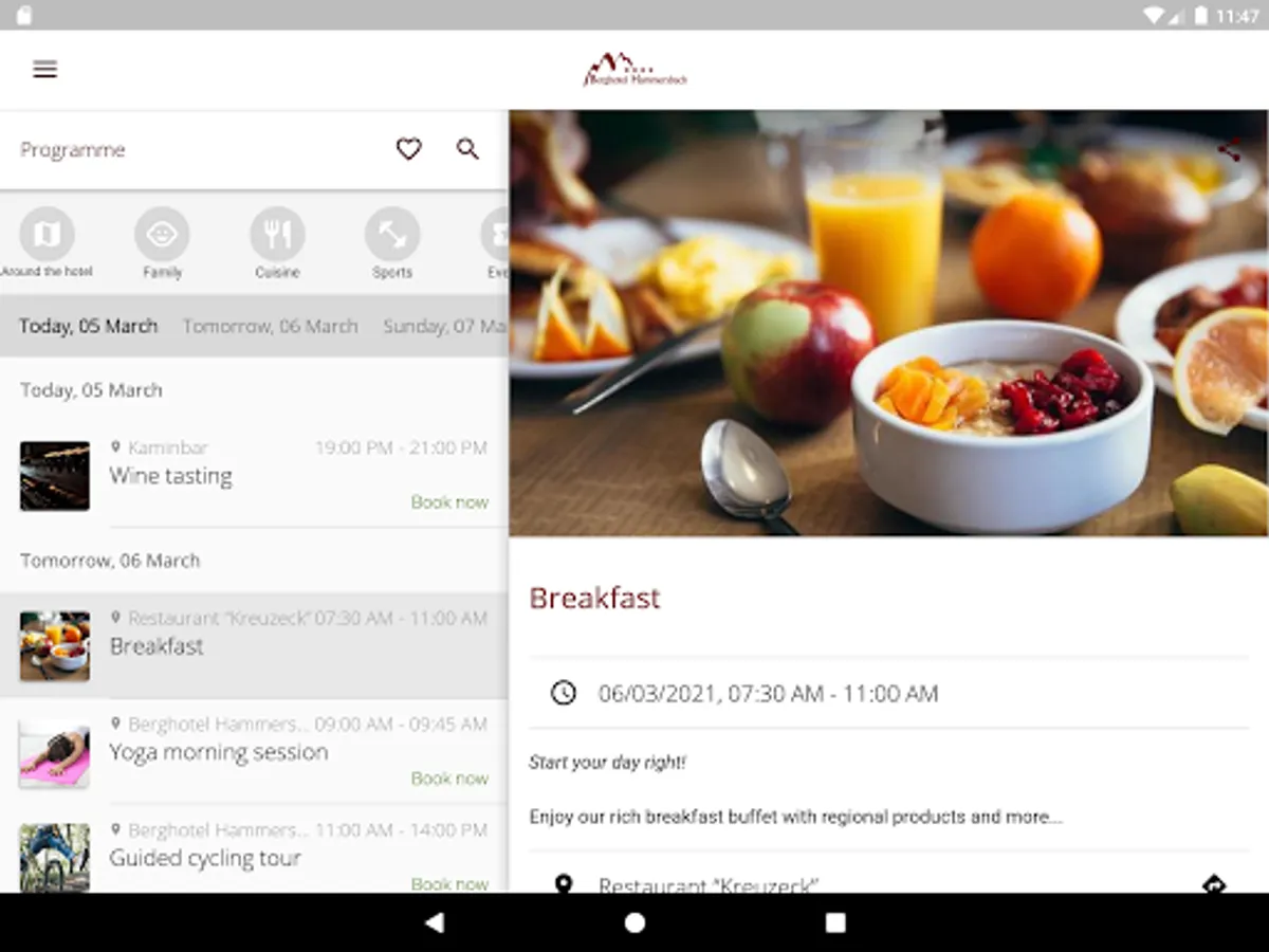 Filter by different interests such as wellness, sports, family, culinary. Put together your own program from our activities. In this way, the Berghotel Hammersbach app offers content tailored to your personal needs.