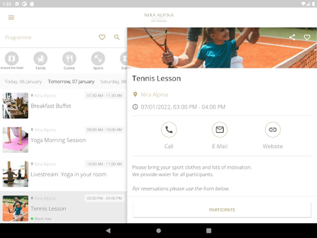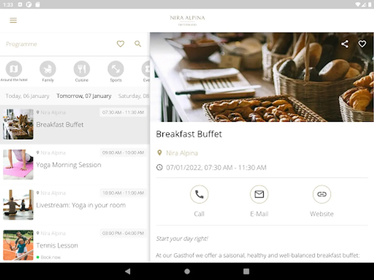 Important standard information about the Nira Alpina such as location and directions as well as opening hours of the restaurant and reception are prepared for you in the app. So that you can quickly find your way around on site, the app offers options for orientation in the Nira Alpina and the surrounding area.