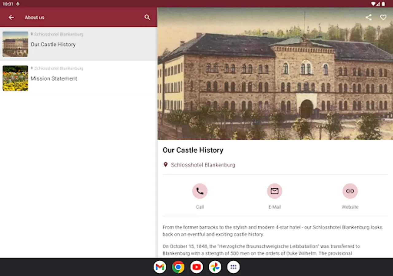Use the practical Schlosshotel Blankenburg app with numerous functions and learn more about us. Our app accompanies you during your stay and informs you about current offers as well as exciting events and gives you further helpful tips and hints.