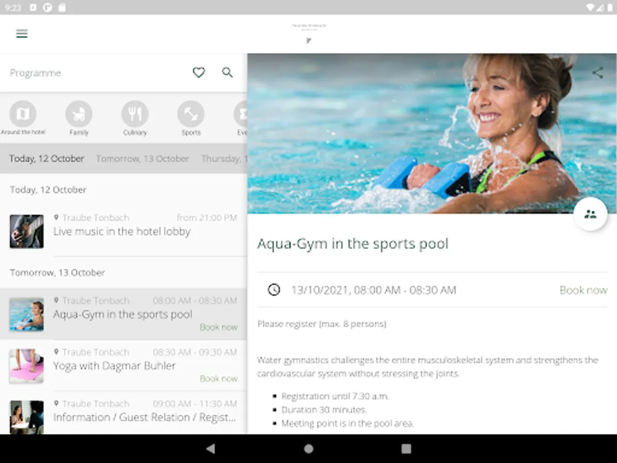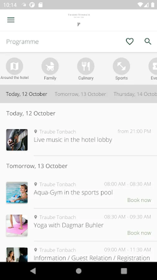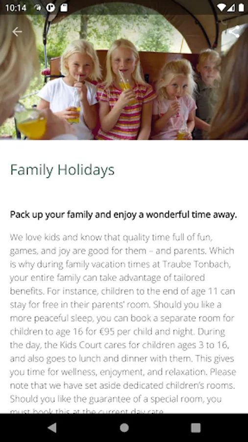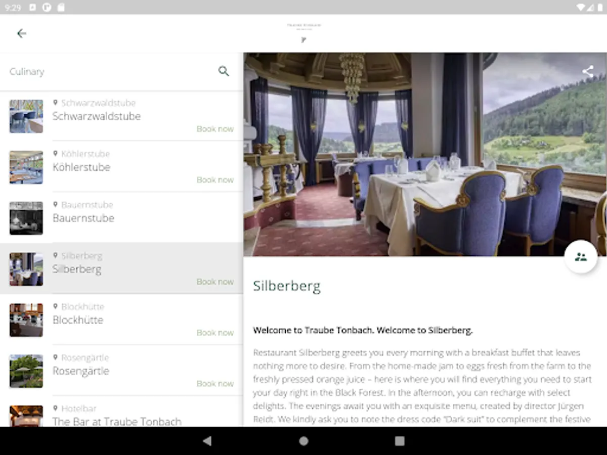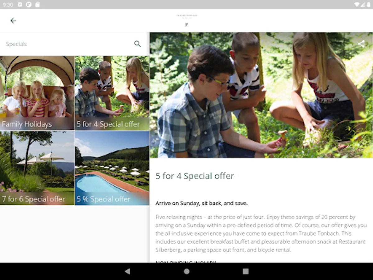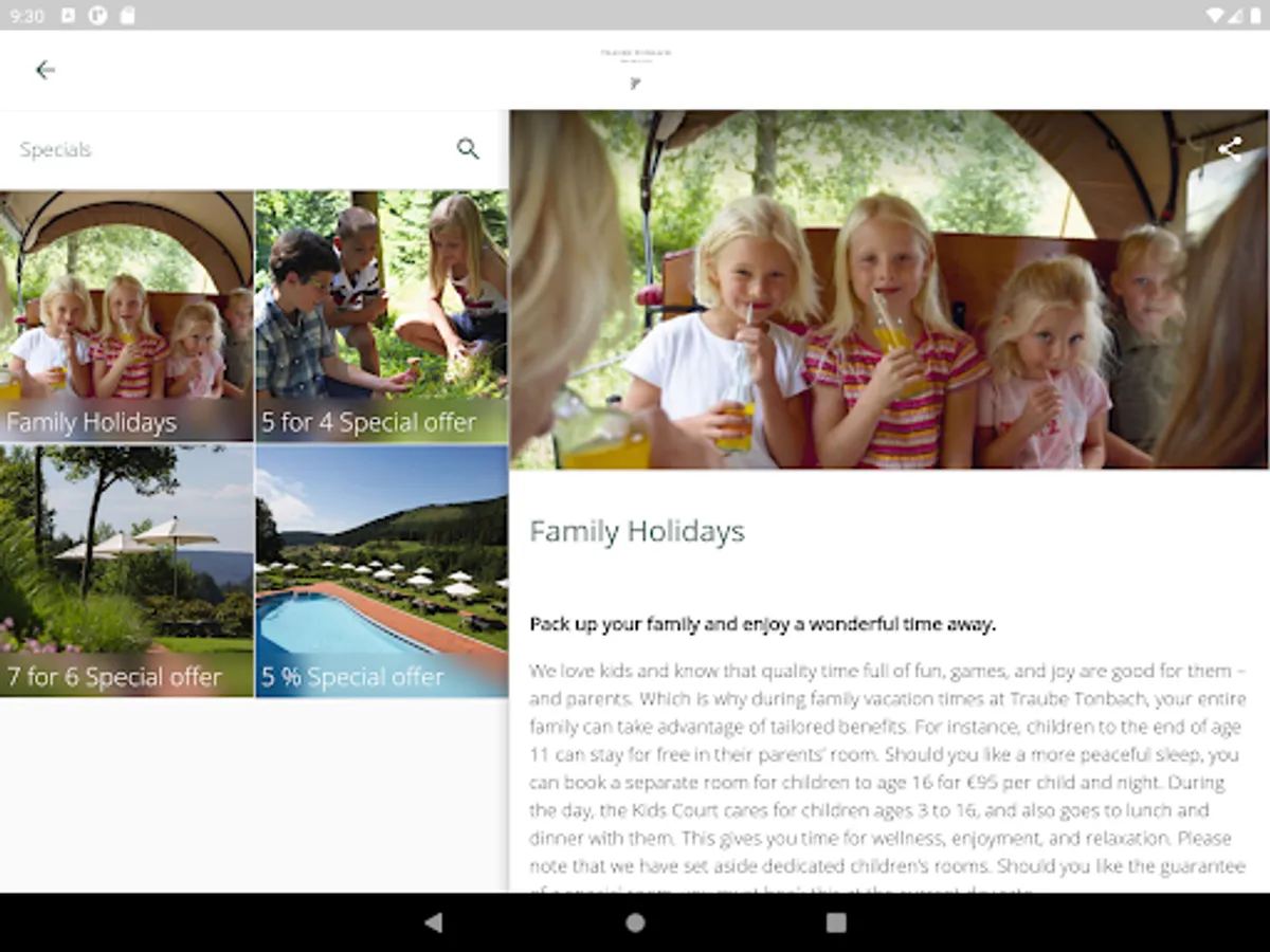 Enjoy with your family exquisite service and world-class cuisine as well as our wellness offers and the beauty of the Black Forest. The Traube Tonbach App accompanies you during your stay, informs you about current events in addition to exciting offers and gives you further helpful tips and hints. Filter by different interests such as culinary, wellness, family or experiences and put together your own program from our activities. In addition, you will find all hotel information and important phone numbers.