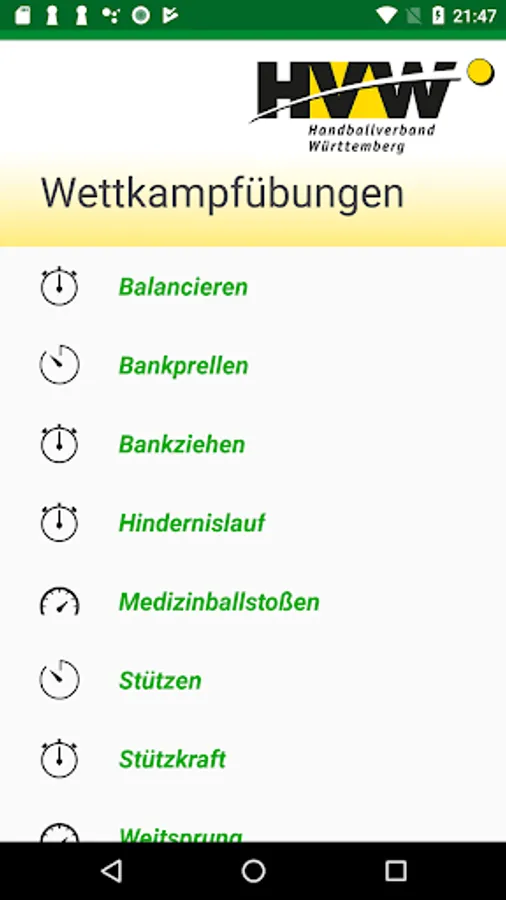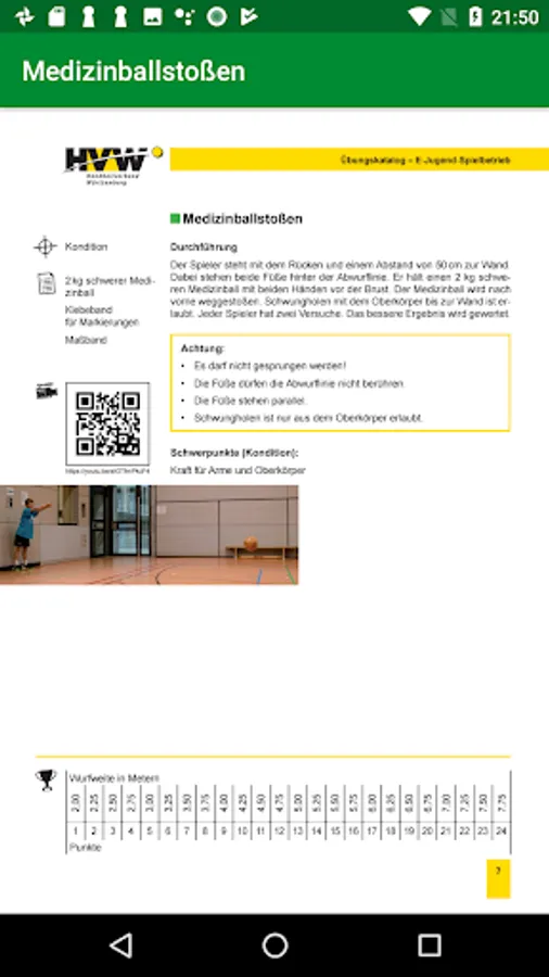 The training catalog of HVW comprises a total of 24 exercises of varying difficulty (8 x light, medium and 8 x 8 x difficult) to focus on coordination and fitness. Each exercise is illustrated extensively detailed in structure and in the implementation. In addition, each exercise is explained on an instruction video. An individual rating scale allows for easy classification of its own performance. The complete training catalog is backed with descriptions and videos in the app any time - even without an Internet connection - available.