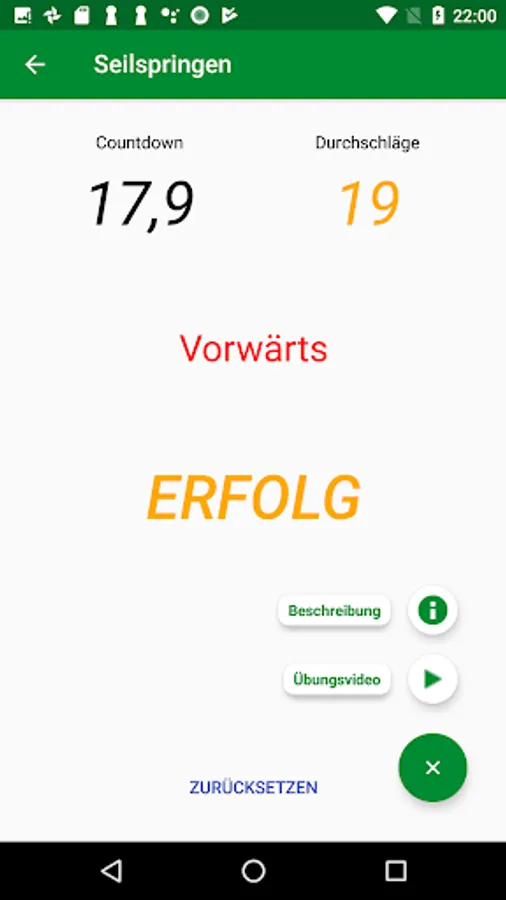 The implementation of the respective competition lifts must be the exercise as described. Depending on the sport movement, there is a timing, a predetermined number of attempts, or it is the reaching rated "fastest" time. The result obtained is put into perspective by means of the exercise specific rating scale and converted to corresponding points. The app supports the implementation and evaluation of the results of the various competition lifts through specific front-ends (for example, stopwatch, countdown, ...), allows you to start and stop the exercise and provides the score rating scale reached under.