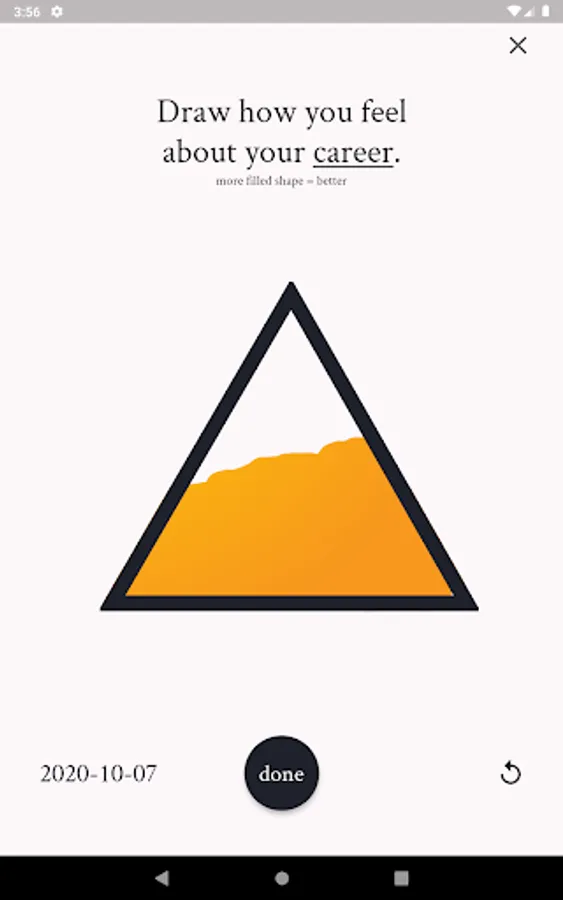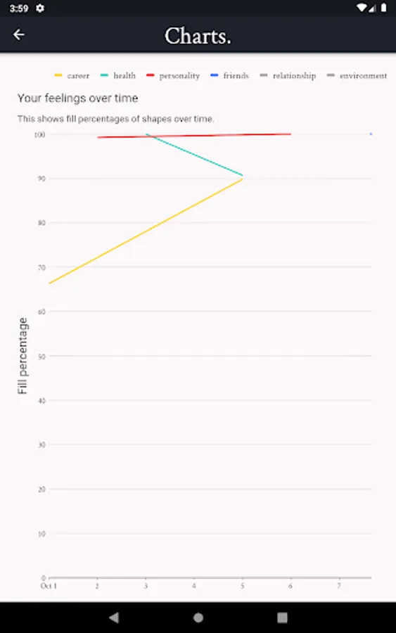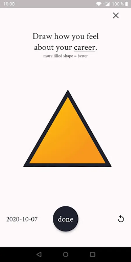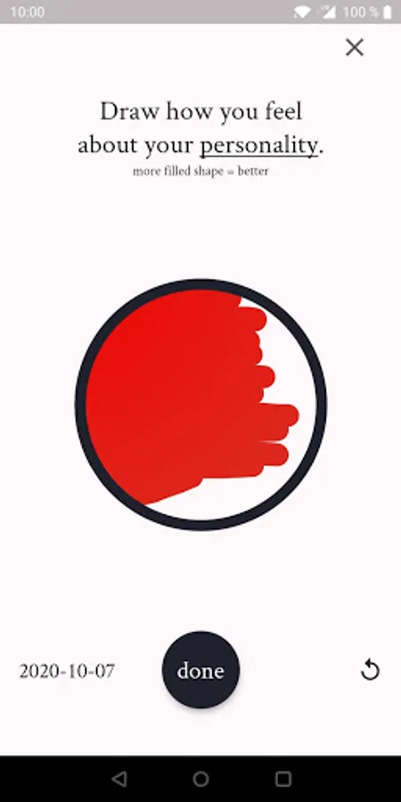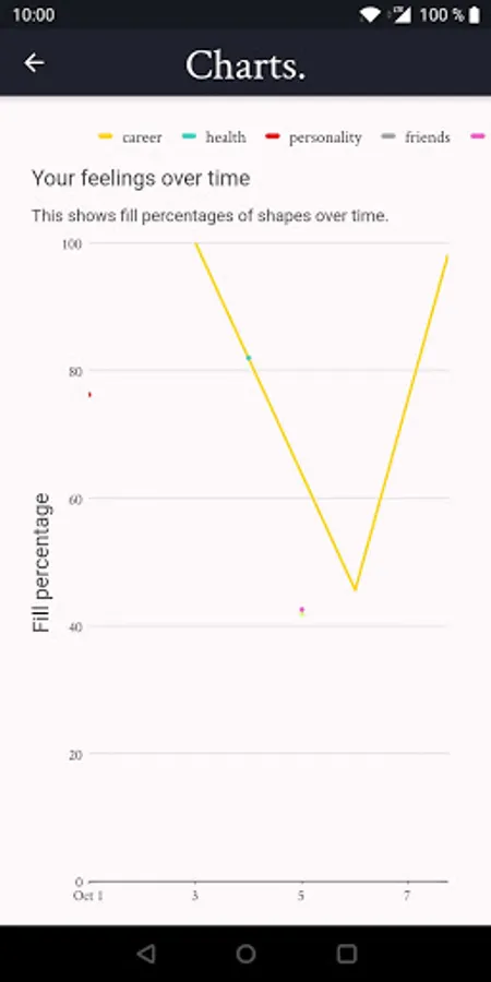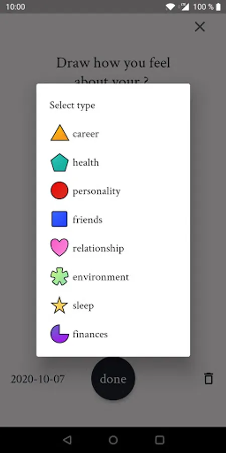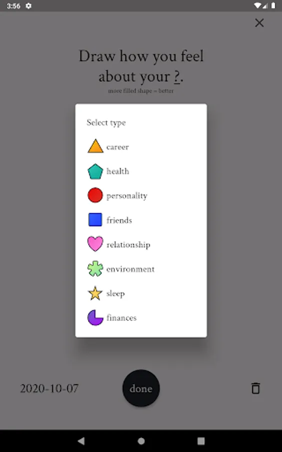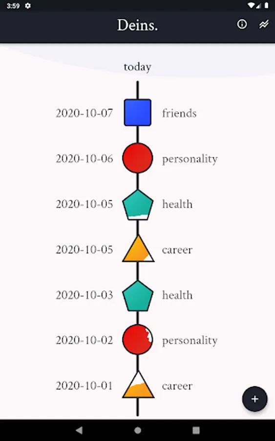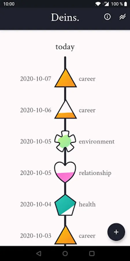Deins allows you to track your feelings about different areas of your life by regularily adding pearls to a chain and painting them. The more a pearl is painted, the better you feel. You can then get a chart of your feelings over time, represented by the percentages of the shapes that are painted.