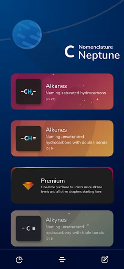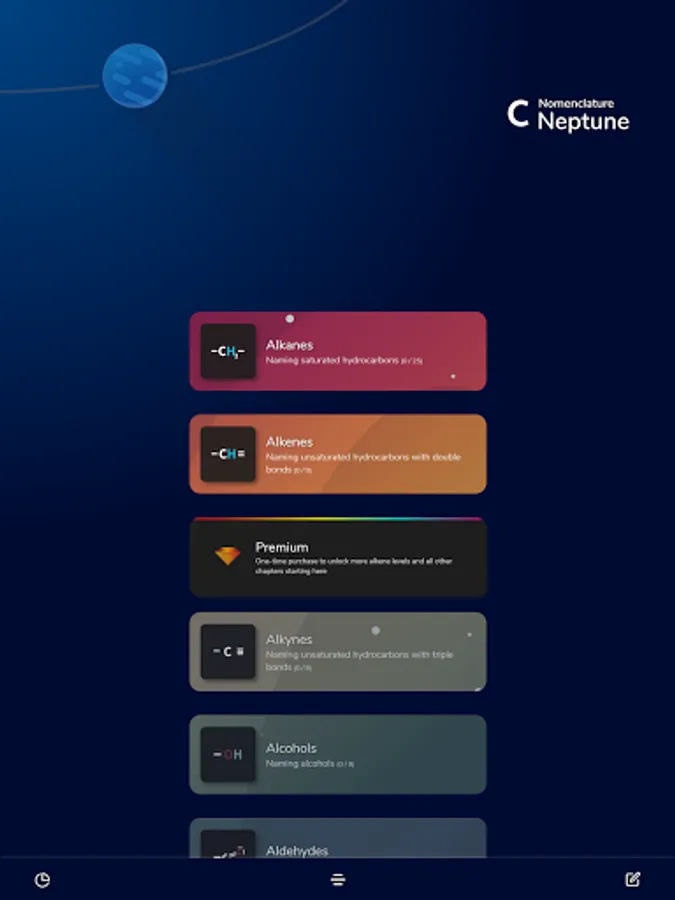 With Planetary Nomenclature Neptune, you can easy and playfully learn about the correct nomenclature of organic molecules in chemistry. You'll get simple, precise tutorials which help you playing through over 70 levels. This way you will become a nomenclature pro in no time!